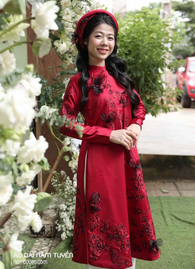 Áo Dài Cưới Nữ Màu Đỏ – Đính Ren 3D Đương Đại, Quyến Rũ Và Đẳng Cấp