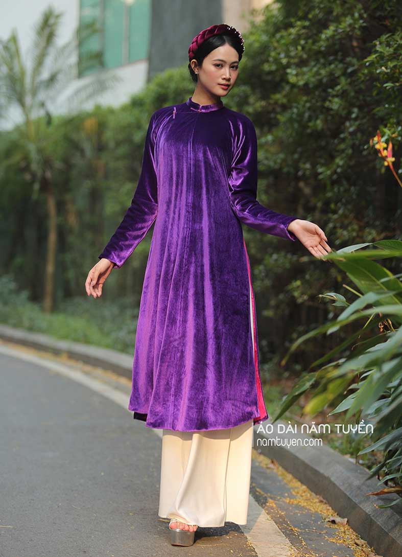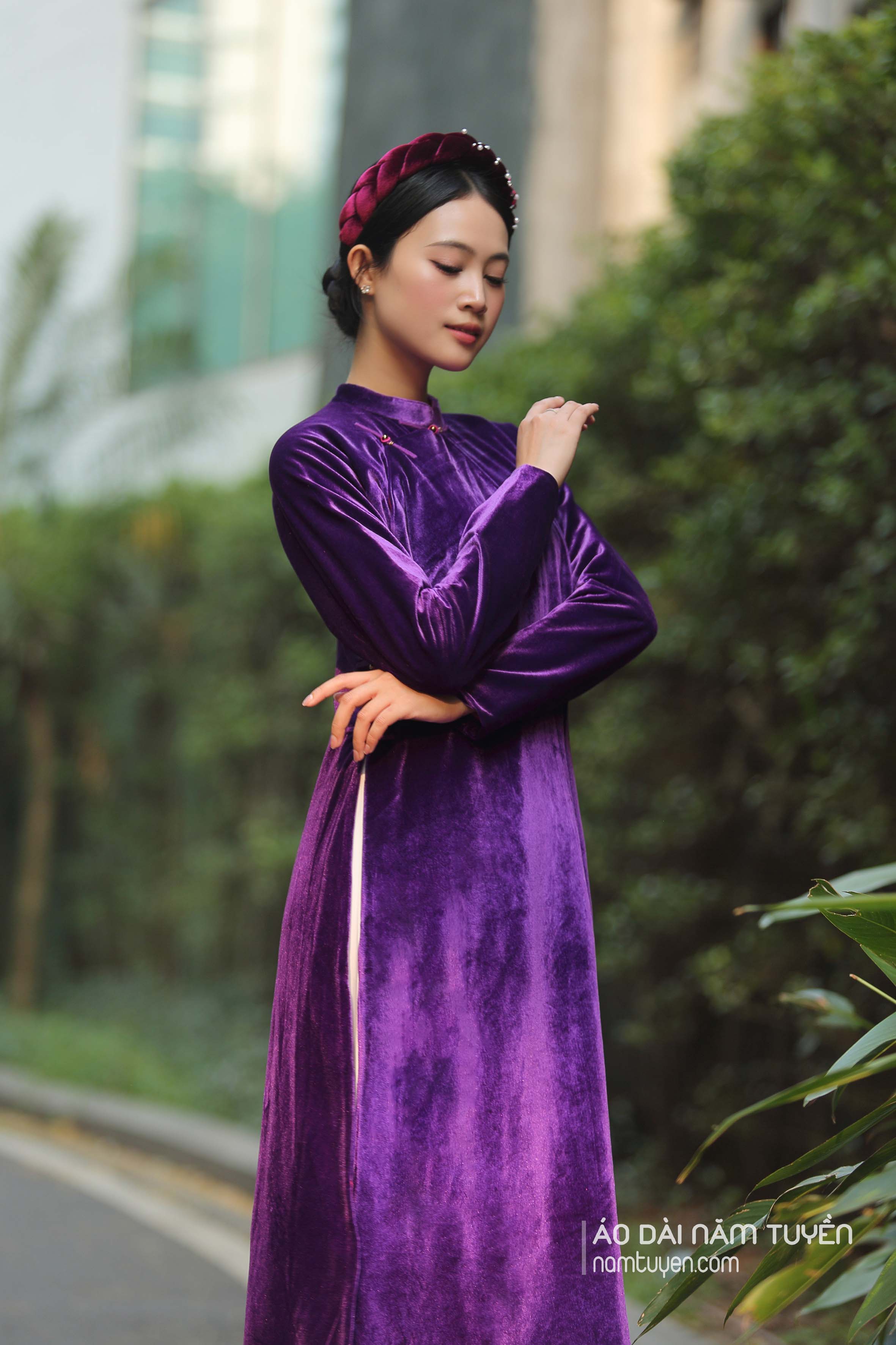Áo dài nữ ngũ thân nhung tím Huế truyền thống