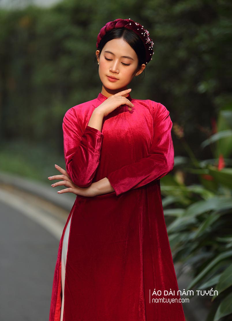 Áo dài nữ ngũ thân nhung đỏ hai lớp truyền thống