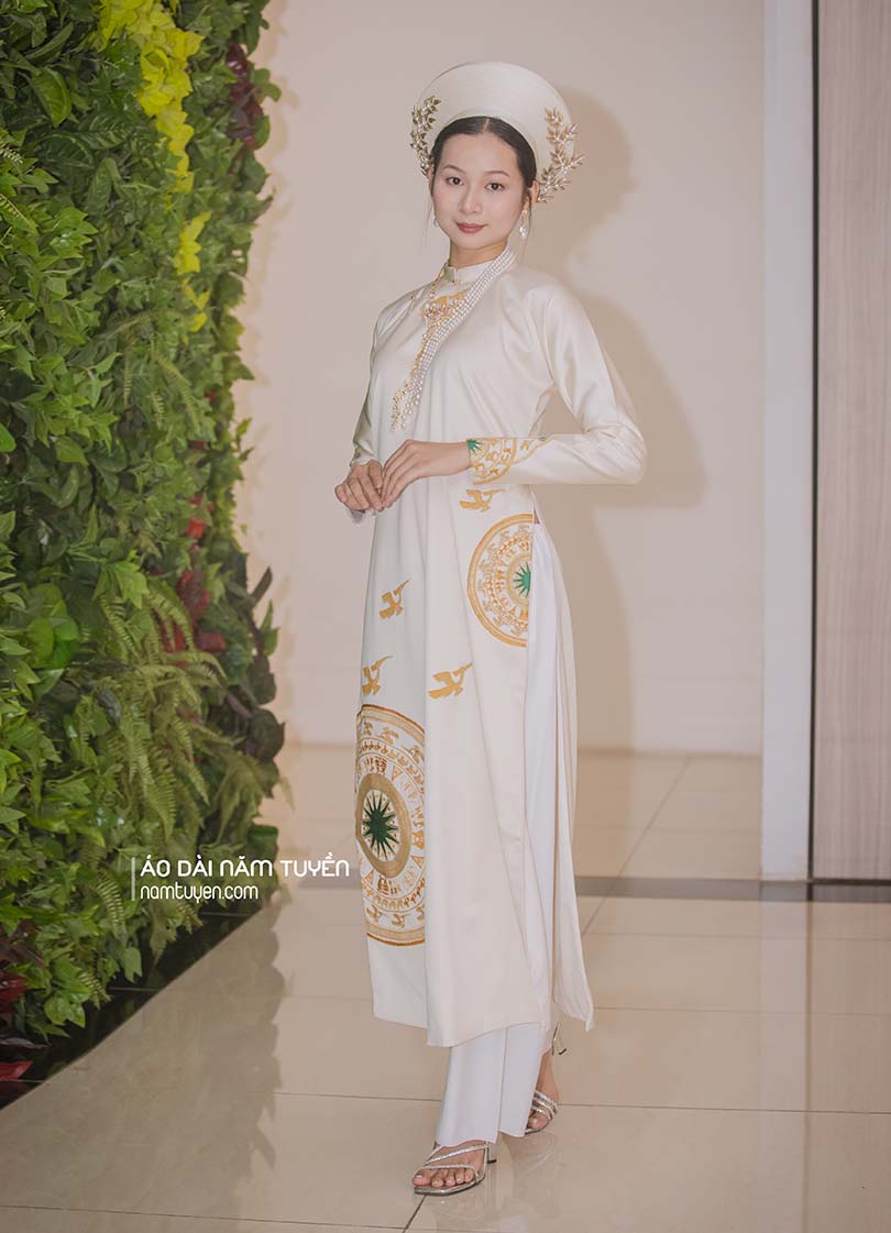 Áo dài nữ ngũ thân thêu họa tiết trống đồng truyền thống