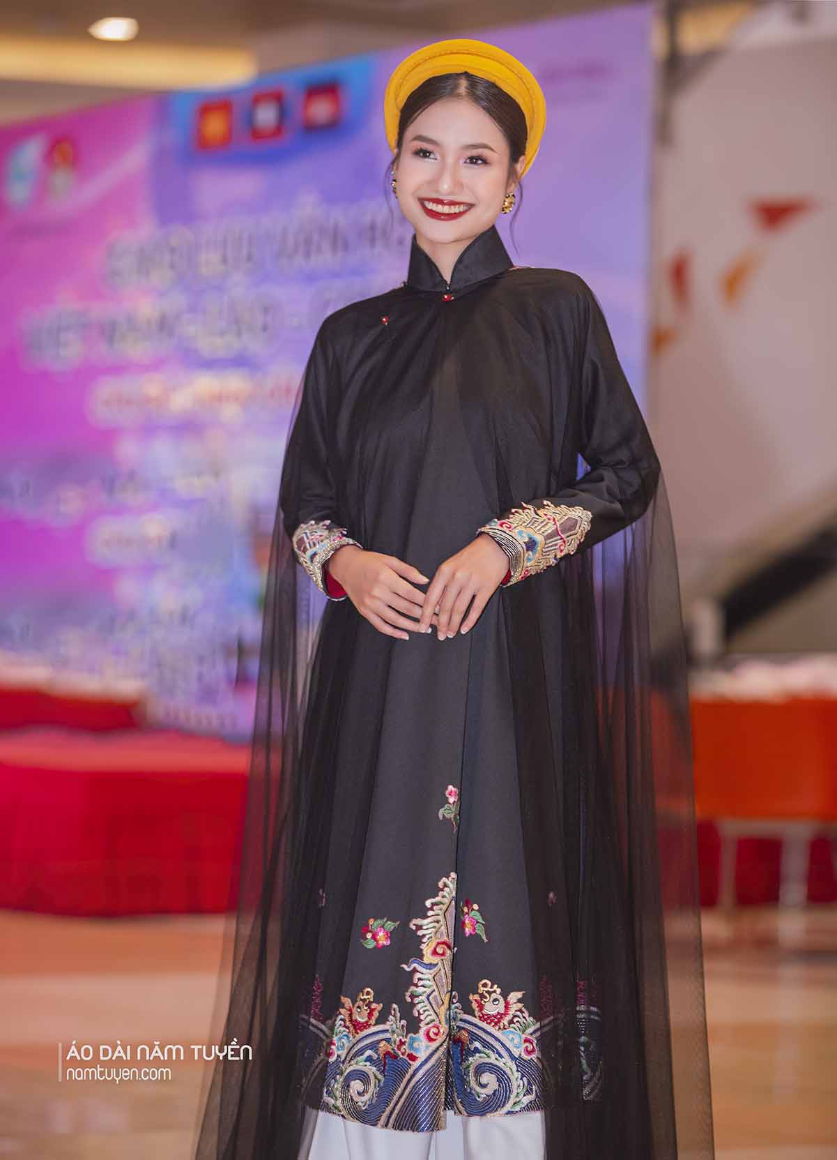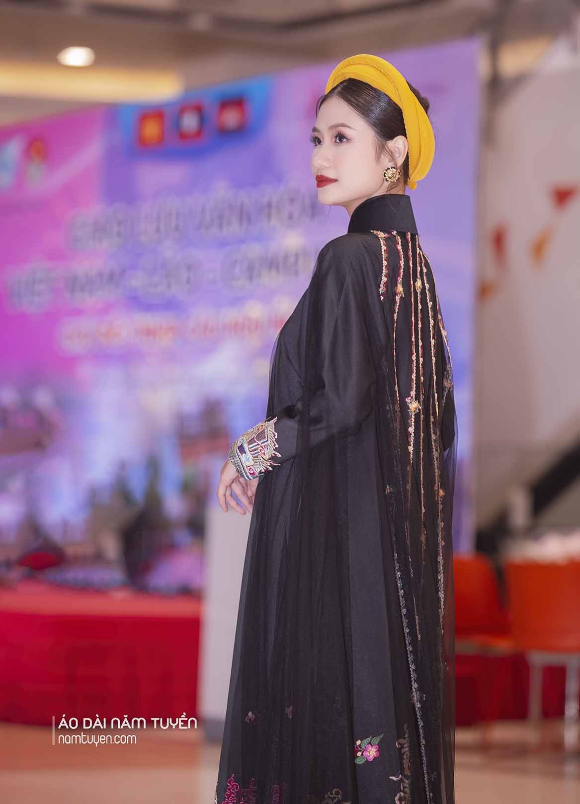 Áo dài truyền thống nữ ngũ thân satin đen thêu thủy ba ấn tượng