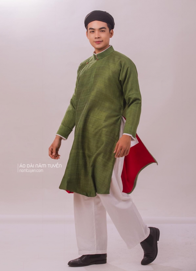 Áo dài nam ngũ thân tay chẽn đũi tơ tằm xanh rêu đậm lót đỏ truyền thống
