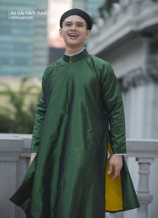 Áo dài nam ngũ thân tay chẽn silk look xanh rêu truyền thống