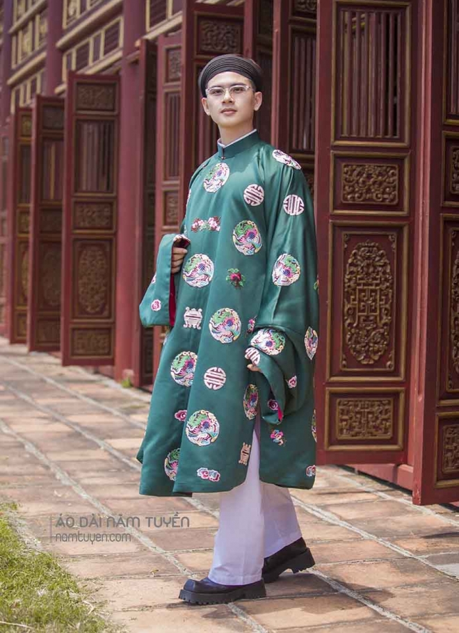 Áo dài nam tay thụng truyền thống thêu hoa văn cổ cung đình