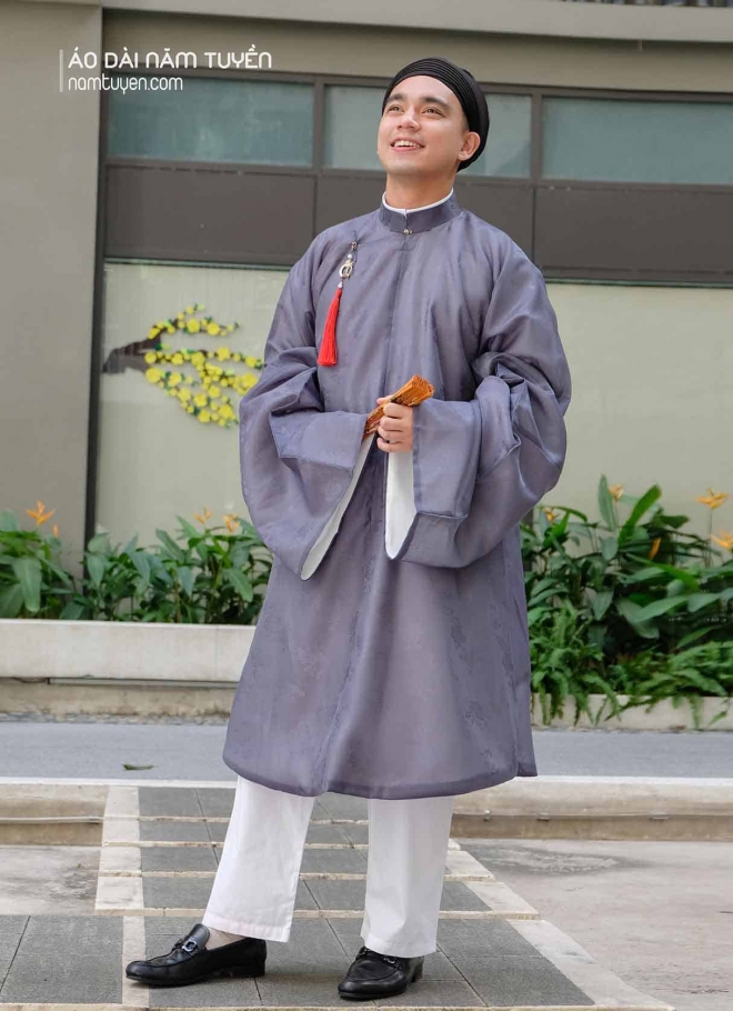 Áo dài nam tay thụng truyền thống vải Sa Hàn xám - Việt phục ngũ thân