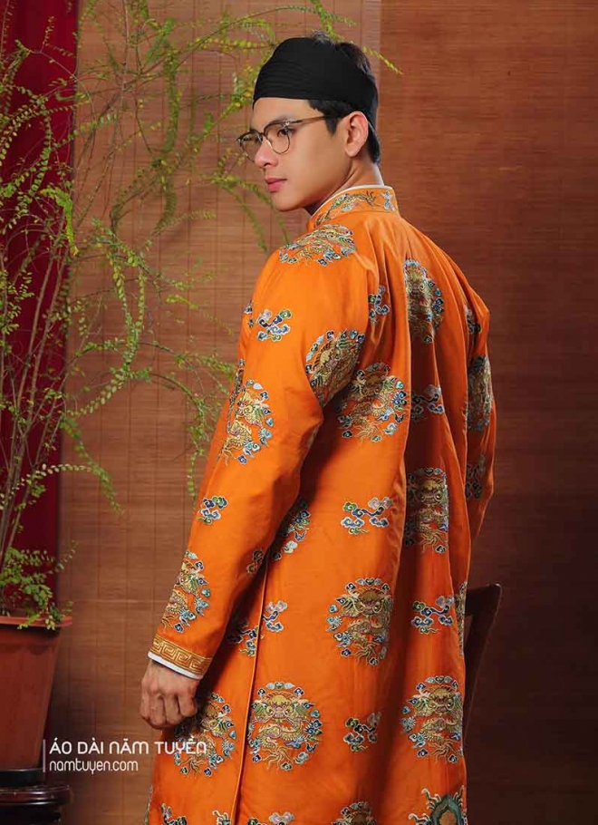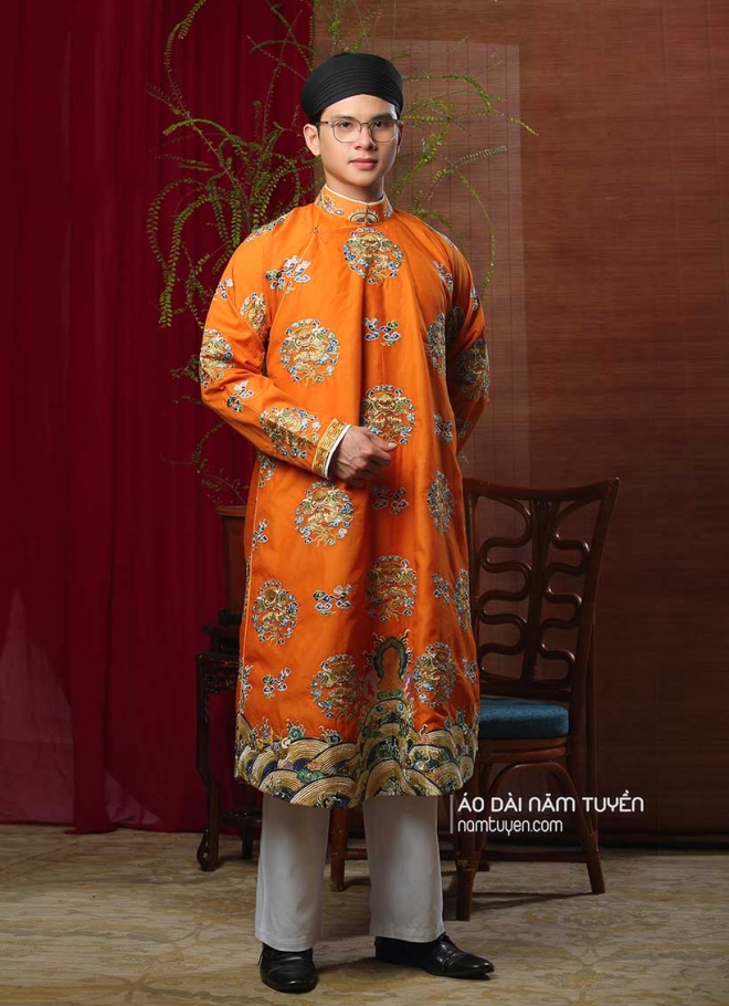 Áo dài nam truyền thống màu cam thêu hoa văn ổ rồng