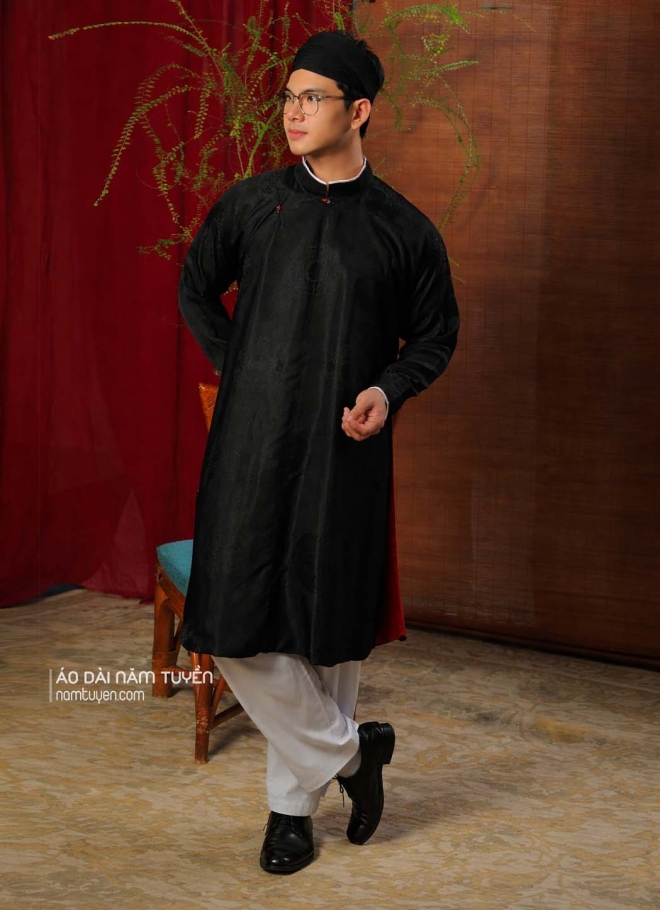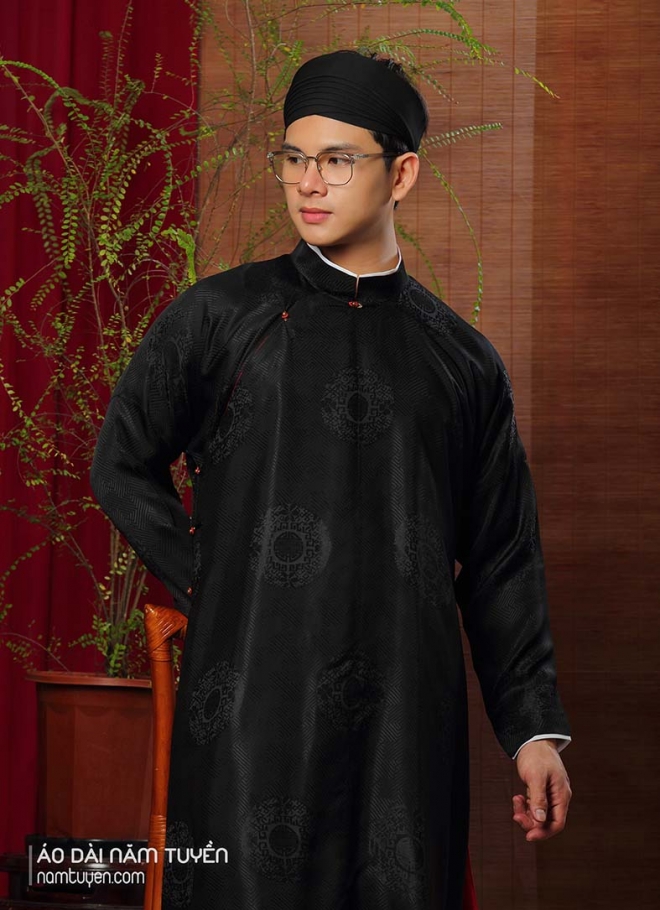 Áo dài nam truyền thống ngũ thân tay chẽn tơ tằm đen hoa văn chữ thọ