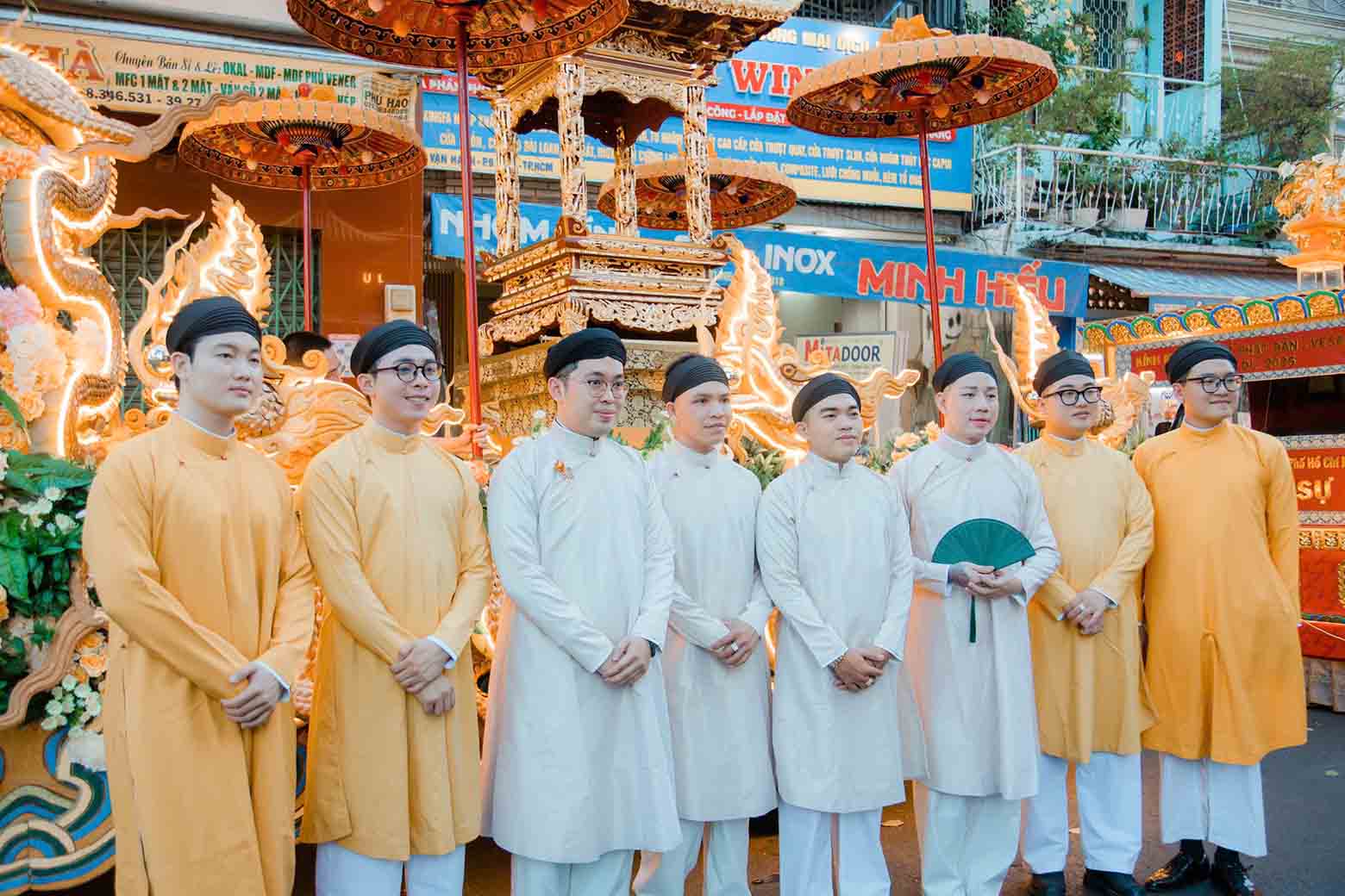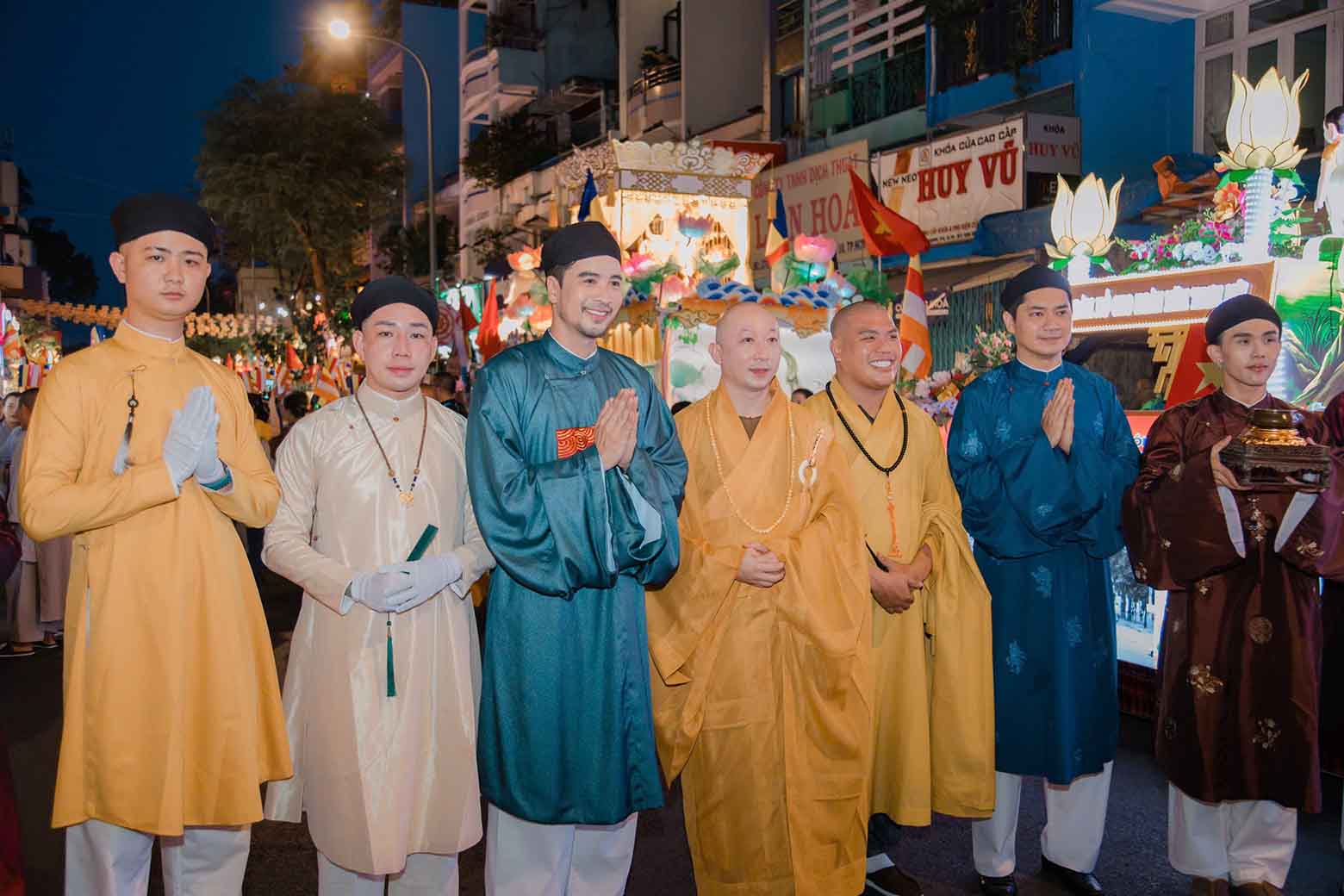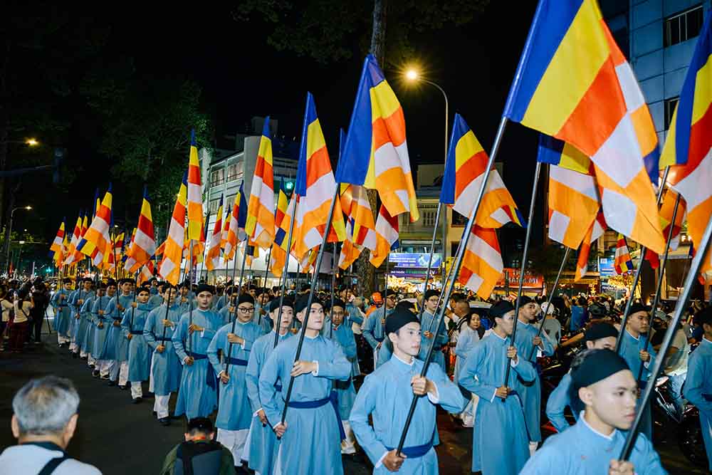 50 nam thanh niên khoác trên mình bộ áo dài ngũ thân Năm Tuyền, sải bước trong đội hình cờ, dẫn đầu đoàn cung rước tôn tượng Đức Phật từ Tổ đình Ấn Quang về Việt Nam Quốc Tự – một nghi lễ trang nghiêm, đầy linh thiêng trong khuôn khổ Đại lễ Vesak 2025.