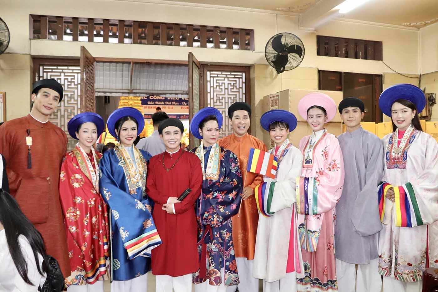 Không chỉ có áo dài ngũ thân, trong không khí lễ hội trang nghiêm của Đại lễ Phật Đản 2025, hình ảnh các nghệ sĩ xuất hiện trong áo Nhật bình, áo Tấc truyền thống của Năm Tuyền đã mang đến một màu sắc trang trọng và đầy uy nghi cho sự kiện.