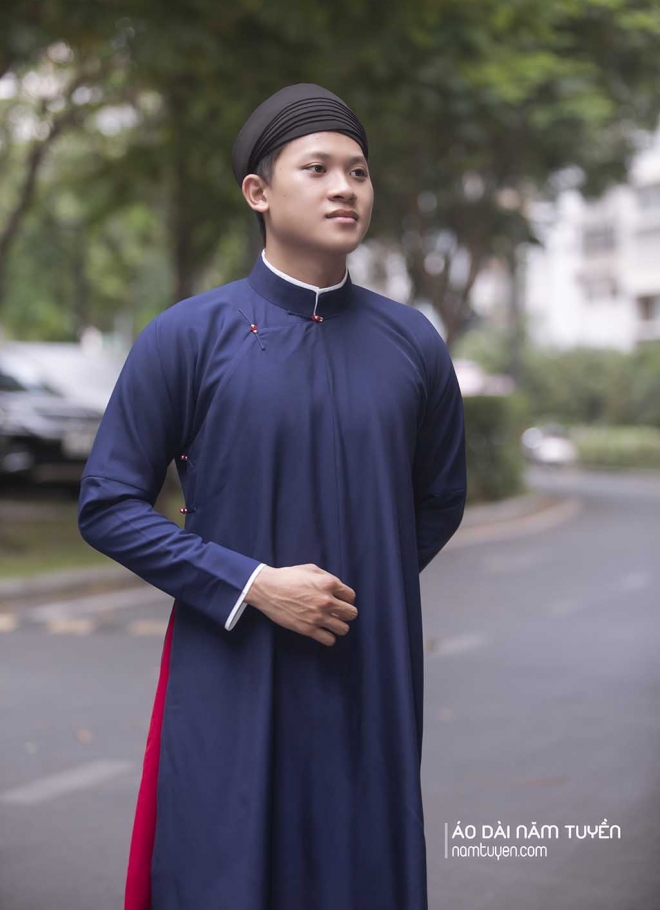 Cấu trúc, phom dáng và các chi tiết được nghiên cứu kỹ bởi nghệ nhân Năm Tuyền, thể hiện tính nguyên bản của áo ngũ thân nhưng vẫn hài hòa cho người mặc hiện đại.
