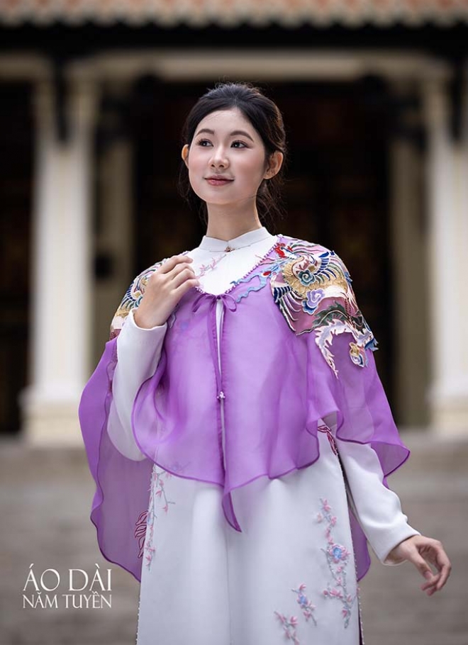 Những cánh hoa mang tính trừu tượng – biểu tượng thẩm mỹ của văn hóa phương Tây – trở thành nguồn cảm hứng cho nghệ nhân trong hành trình tìm kiếm một góc nhìn mới về áo dài truyền thống. Trên nền thiết kế ngũ thân, họa tiết hoa được tái hiện bằng ngôn ngữ sáng tạo đương đại, kết hợp cùng áo choàng khoác ngoài trang trí họa tiết Phượng bay, như một sự giao thoa tự nhiên giữa thanh lịch châu Âu và hồn cốt Á Đông.