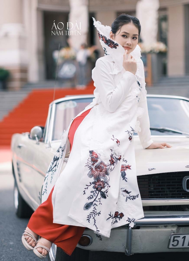 Áo dài ngũ thân nữ thiết kế với họa tiết ren, hoa thêu nổi của Năm Tuyền là sự kết hợp giữa di sản trang phục Việt và nghệ thuật sáng tạo đương đạiTrên mỗi tà áo, hoa, ren và lụa quyện vào nhau mềm mại, tự nhiên, sống động theo từng nhịp di chuyển của người mặc.