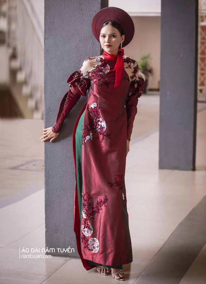 Tất cả được kết hợp hoàn hảo với form áo ôm nhẹ vòng ngực – eo, tôn dáng chuẩn nhưng vẫn giữ chất thanh lịch, kín đáo vốn có của áo dài truyền thống. Chi tiết này không chỉ làm nổi bật đôi tay, mà còn khiến tổng thể thiết kế vừa sang trọng, vừa hiện đại, giữ trọn vẻ đẹp di sản Việt trong từng đường nét.