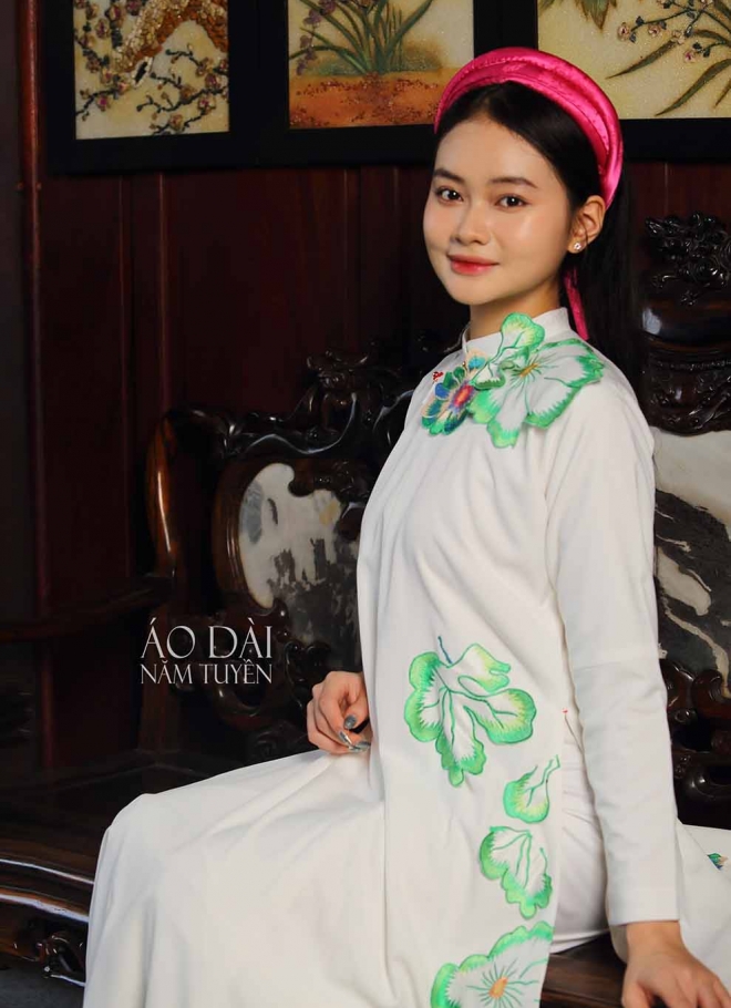 Áo dài ngũ thân nữ thiết kế với họa tiết ren, hoa thêu nổi của Năm Tuyền là sự kết hợp giữa di sản trang phục Việt và nghệ thuật sáng tạo đương đạiTrên mỗi tà áo, hoa, ren và lụa quyện vào nhau mềm mại, tự nhiên, sống động theo từng nhịp di chuyển của người mặc.