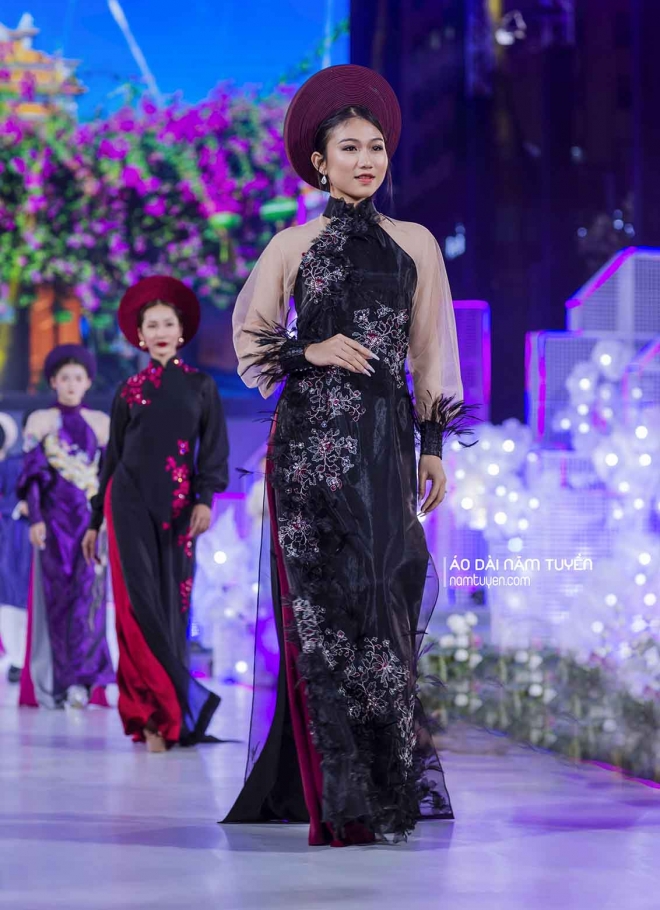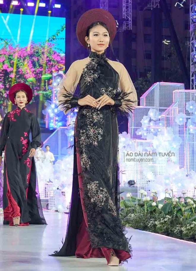 Giữ trọn phom dáng áo dài hai tà – cổ cao – tay dài đặc trưng, bộ sưu tập dạ hội vẫn mang nét kín đáo, thanh lịch mà người Việt gìn giữ suốt nhiều thế kỷ. Trên nền tảng truyền thống ấy, Nghệ nhân Năm Tuyền xây dựng phong cách thiết kế mới mẻ thông qua: