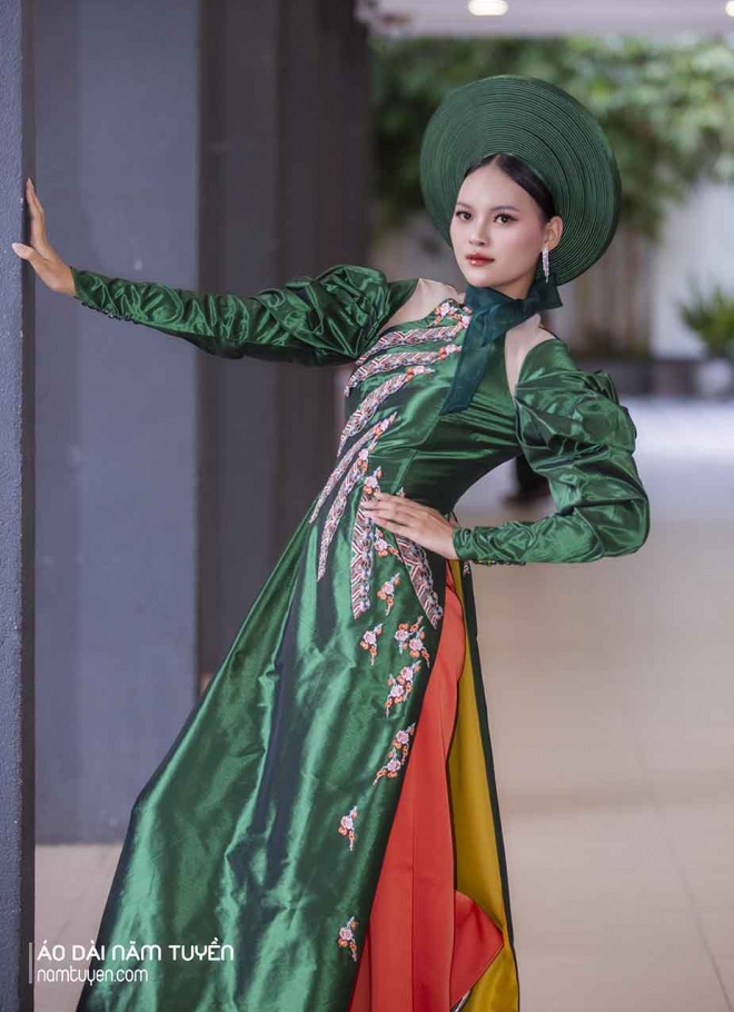 Tất cả được kết hợp hoàn hảo với form áo ôm nhẹ vòng ngực – eo, tôn dáng chuẩn nhưng vẫn giữ chất thanh lịch, kín đáo vốn có của áo dài truyền thống. Chi tiết này không chỉ làm nổi bật đôi tay, mà còn khiến tổng thể thiết kế vừa sang trọng, vừa hiện đại, giữ trọn vẻ đẹp di sản Việt trong từng đường nét.