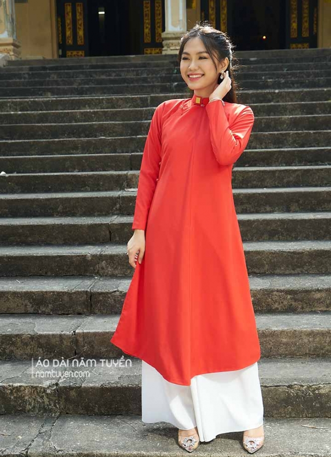 Vạt áo dài quá gối, phom đứng trang nghiêm.