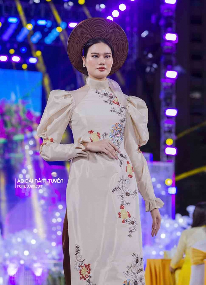 Giữ trọn phom dáng áo dài hai tà – cổ cao – tay dài đặc trưng, bộ sưu tập dạ hội vẫn mang nét kín đáo, thanh lịch mà người Việt gìn giữ suốt nhiều thế kỷ. Trên nền tảng truyền thống ấy, Nghệ nhân Năm Tuyền xây dựng phong cách thiết kế mới mẻ thông qua: