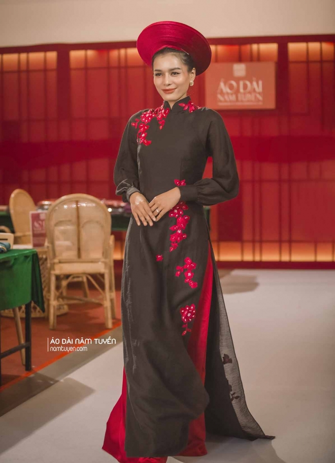 Từ nền vải đen sang trọng, những bông hoa ren đỏ được kết thủ công tạo chiều sâu và sự mềm mại cho tổng thể. Form áo truyền thống ôm nhẹ cơ thể, tôn đường cong và phù hợp nhiều dáng người.