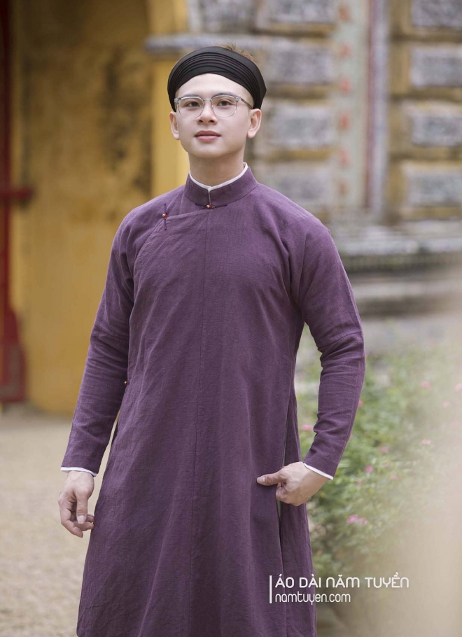 Áo dài truyền thống nam ngũ thân tay chẽn chất liệu gai tím Huế