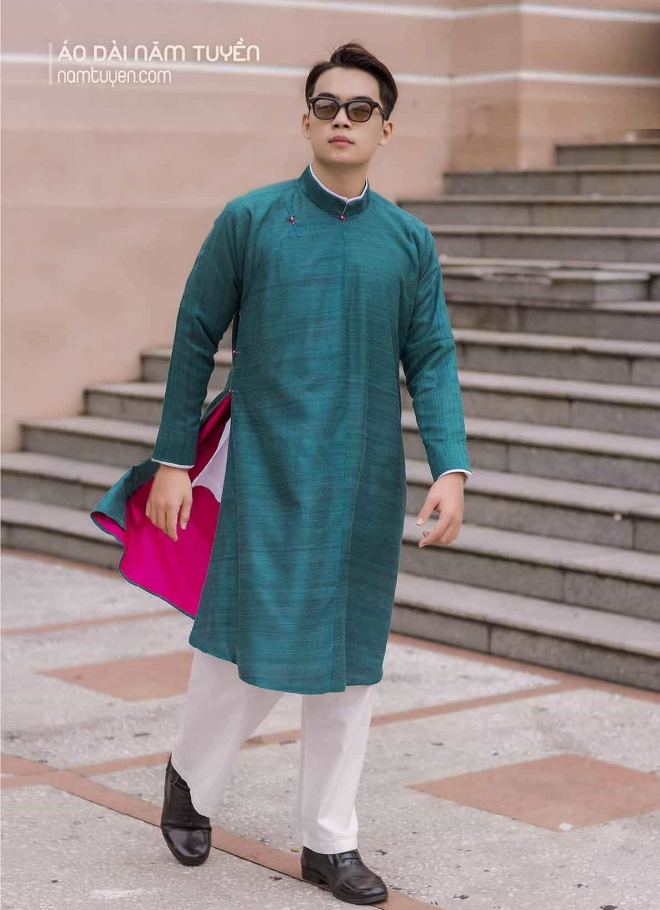 Áo dài truyền thống ngũ thân nam đũi tơ tằm lót hồng