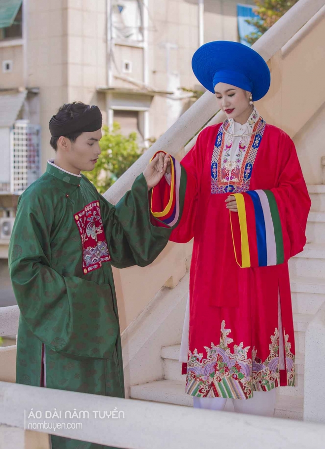 Chú rể: Diện áo ngũ thân tay thụng hoặc tay chẽn của Năm Tuyền để tạo nên hình ảnh cặp đôi hòa hợp, mang tinh thần “phu thê tương hợp”.
