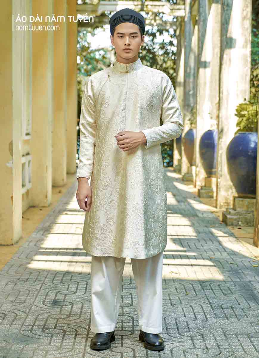 • Chú rể: Diện áo ngũ thân tay thụng hoặc tay chẽn của Năm Tuyền để tạo nên hình ảnh cặp đôi hòa hợp, mang tinh thần “phu thê tương hợp”.