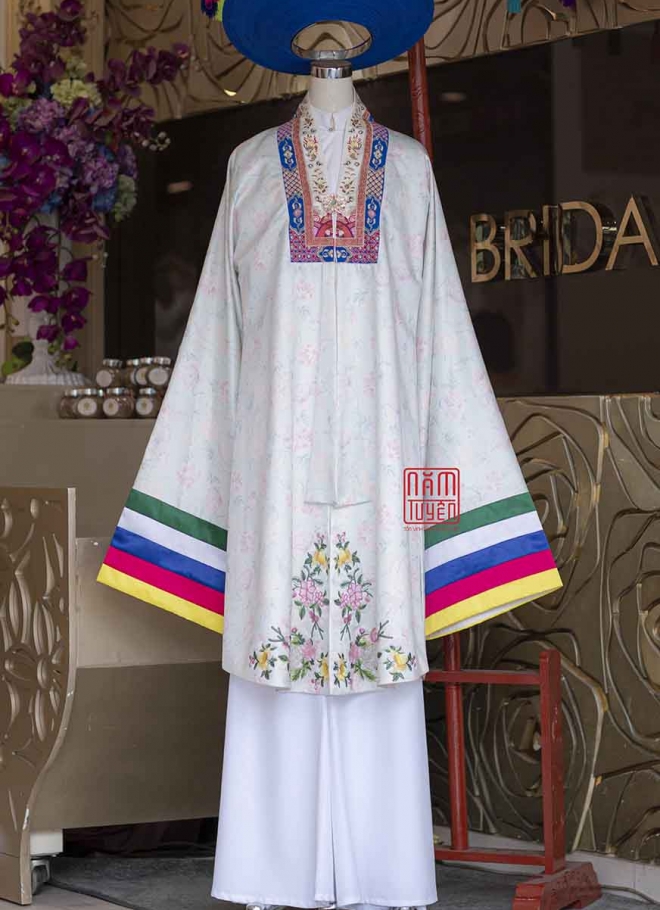 • Chú rể: Diện áo ngũ thân tay thụng hoặc tay chẽn của Năm Tuyền để tạo nên hình ảnh cặp đôi hòa hợp, mang tinh thần “phu thê tương hợp”.