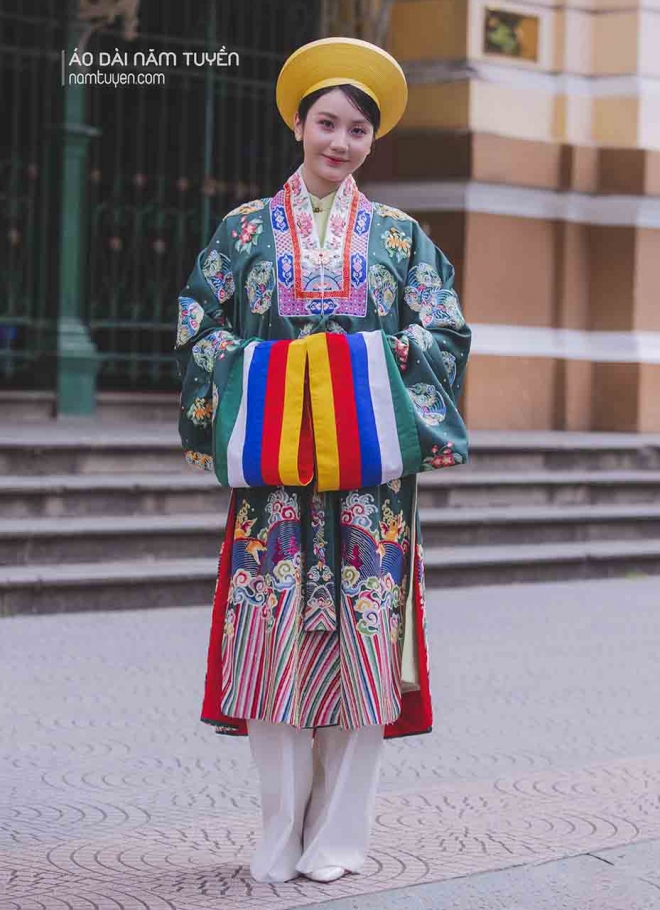 • Chú rể: Diện áo ngũ thân tay thụng hoặc tay chẽn của Năm Tuyền để tạo nên hình ảnh cặp đôi hòa hợp, mang tinh thần “phu thê tương hợp”.