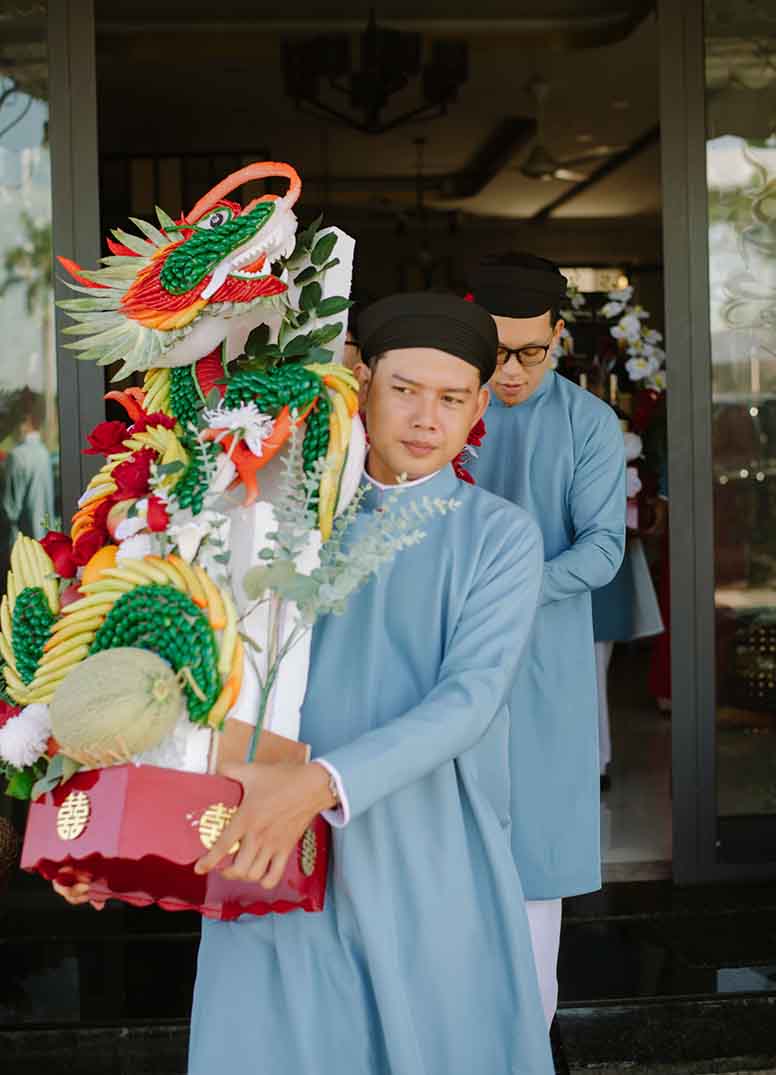 Áo dài bê tráp truyền thống cho đội nhà trai màu xanh lý