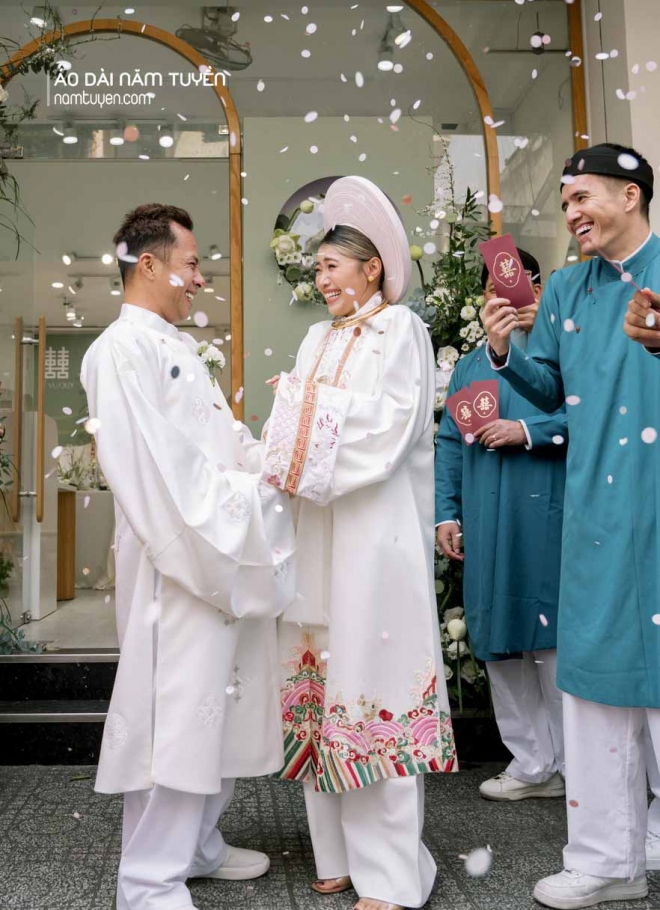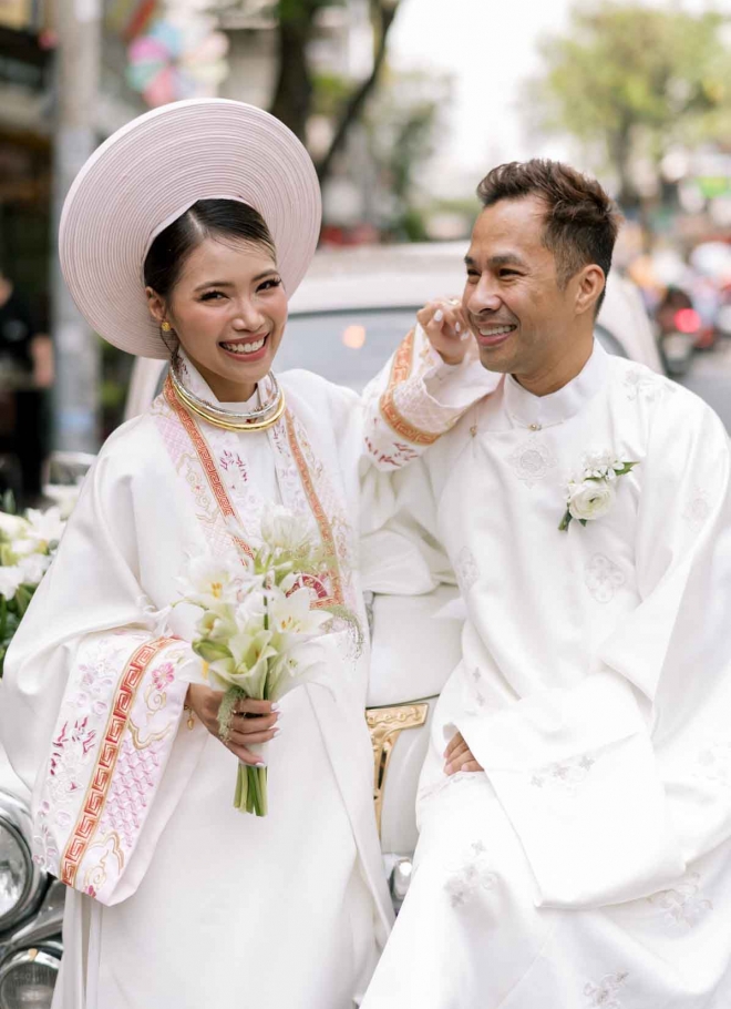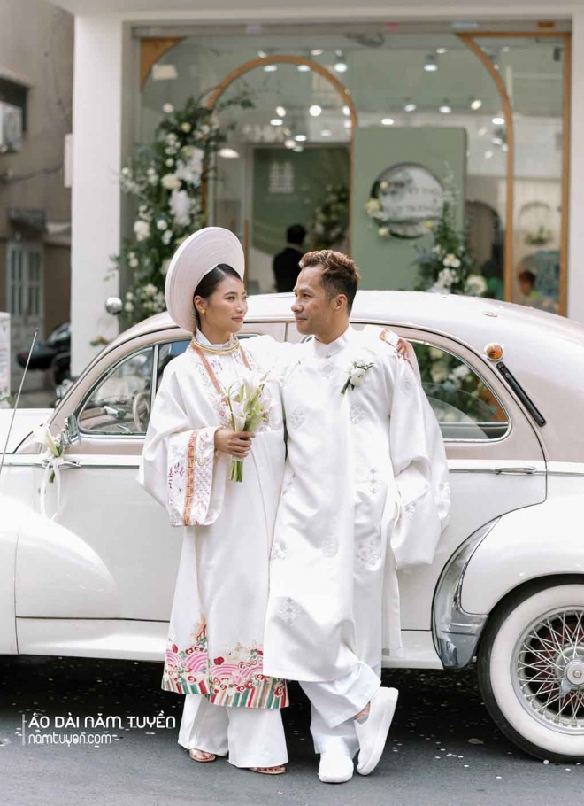 Bộ đôi Áo dài cưới trắng kem Nhật Bình và Áo Tấc trang trọng ngày hạnh phúc