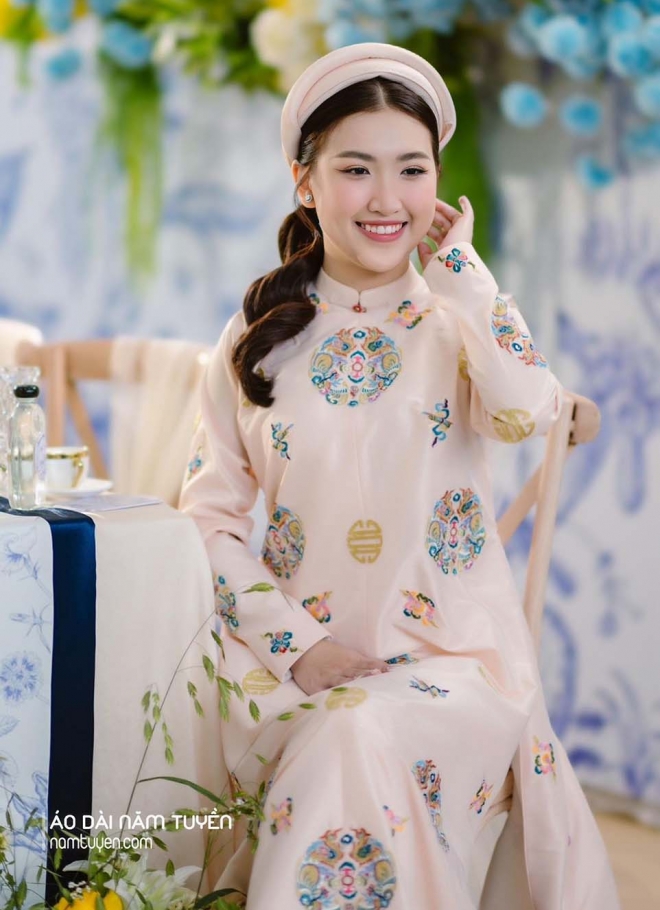 Áo Nhật Bình Năm Tuyền được may theo lối cổ phục cung đình Việt, mang vẻ đẹp trang nghiêm mà vẫn đầy duyên dáng.
