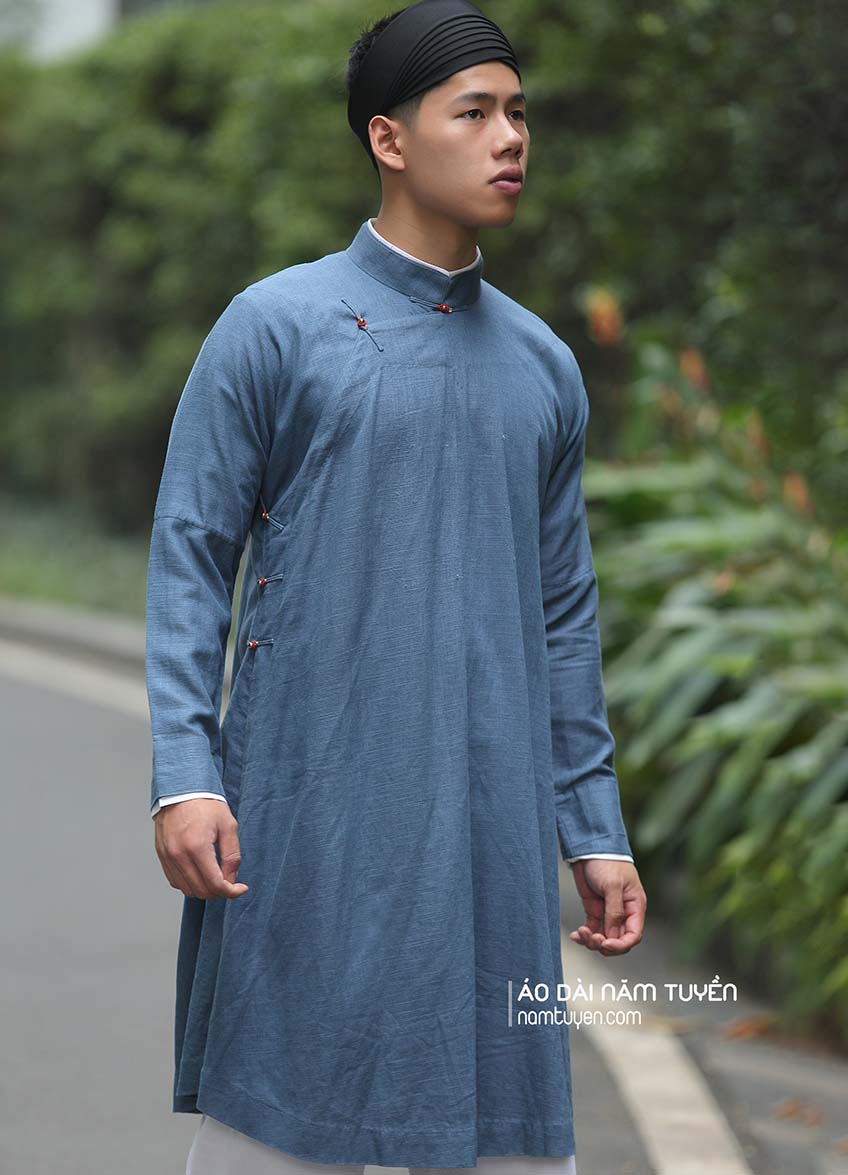 Áo dài nam truyền thống tay chẽn vải gai xanh da trời