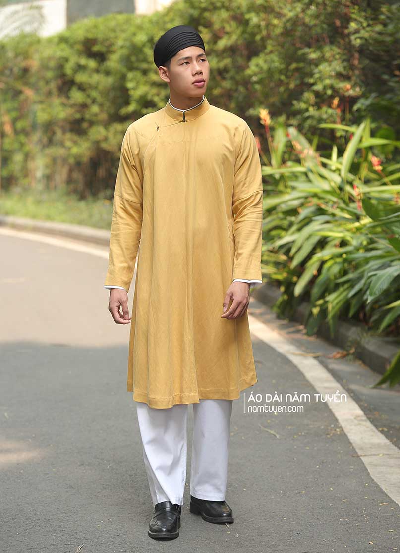Áo dài nam ngũ thân tay chẽn vải gai vàng truyền thống