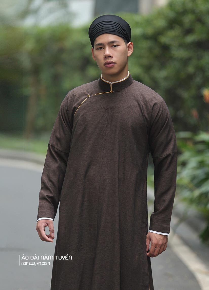 Áo dài nam ngũ thân gam nâu trầm mạnh mẽ kết hợp đường viền vàng tinh tế