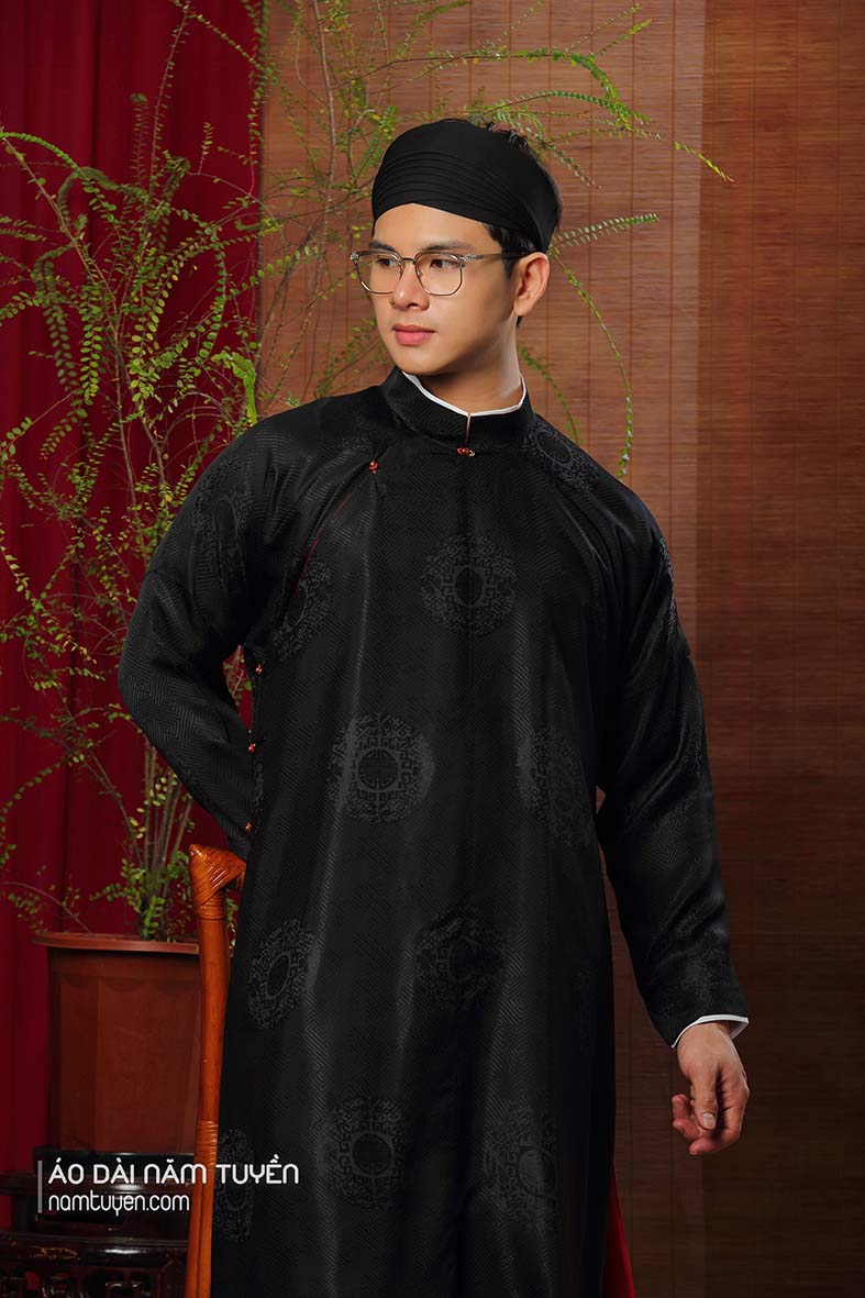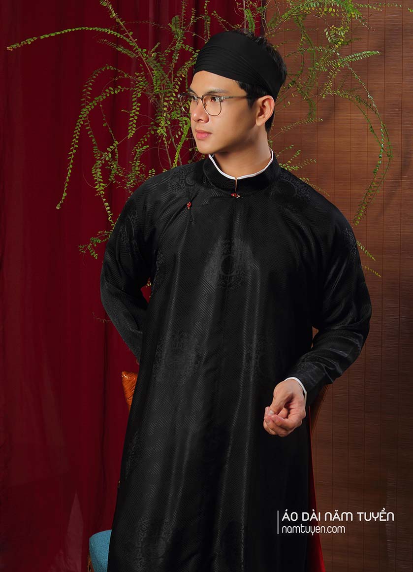 Áo dài nam truyền thống ngũ thân tay chẽn tơ tằm đen hoa văn chữ thọ