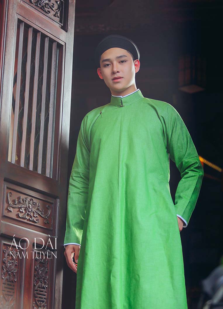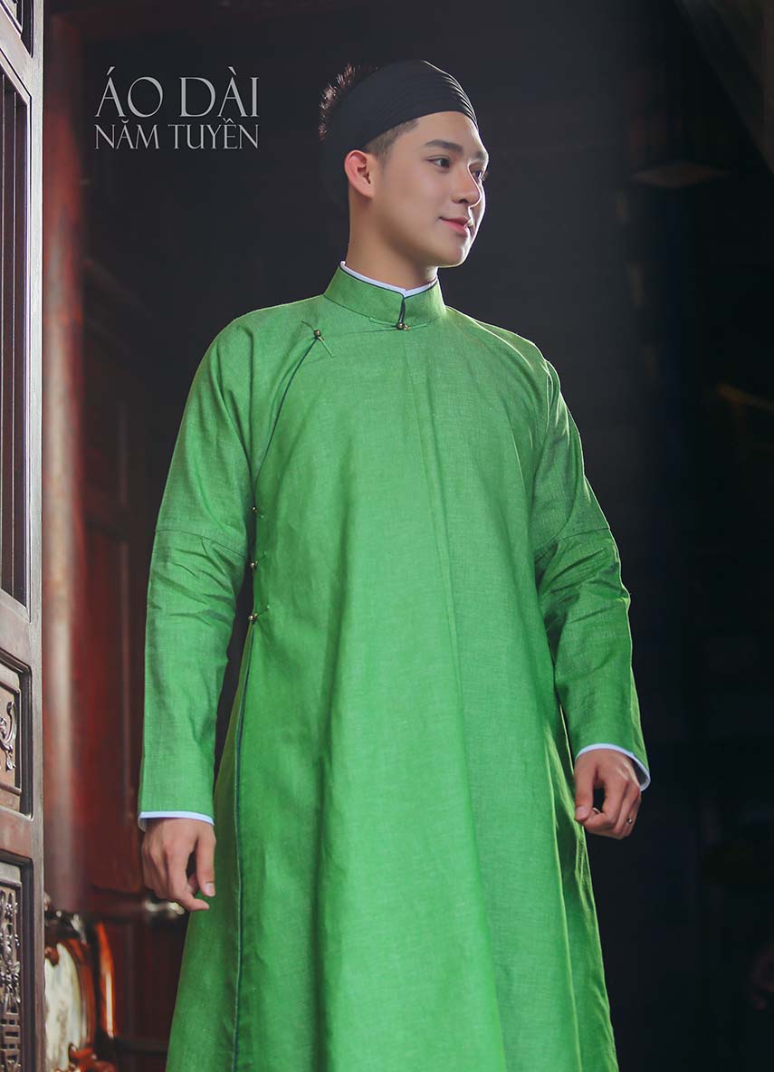 Áo dài nam ngũ thân truyền thống màu xanh lá vải gai