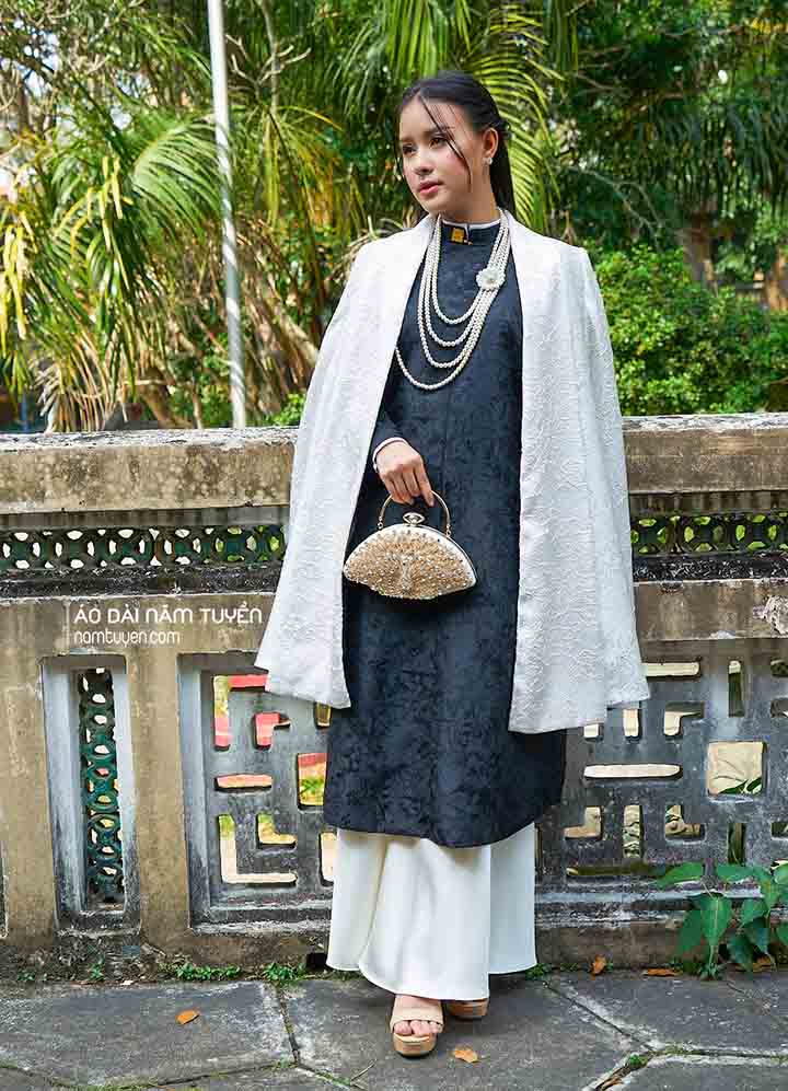 Áo dài ngũ thân nữ gấm đen truyền thống họa tiết tinh xảo
