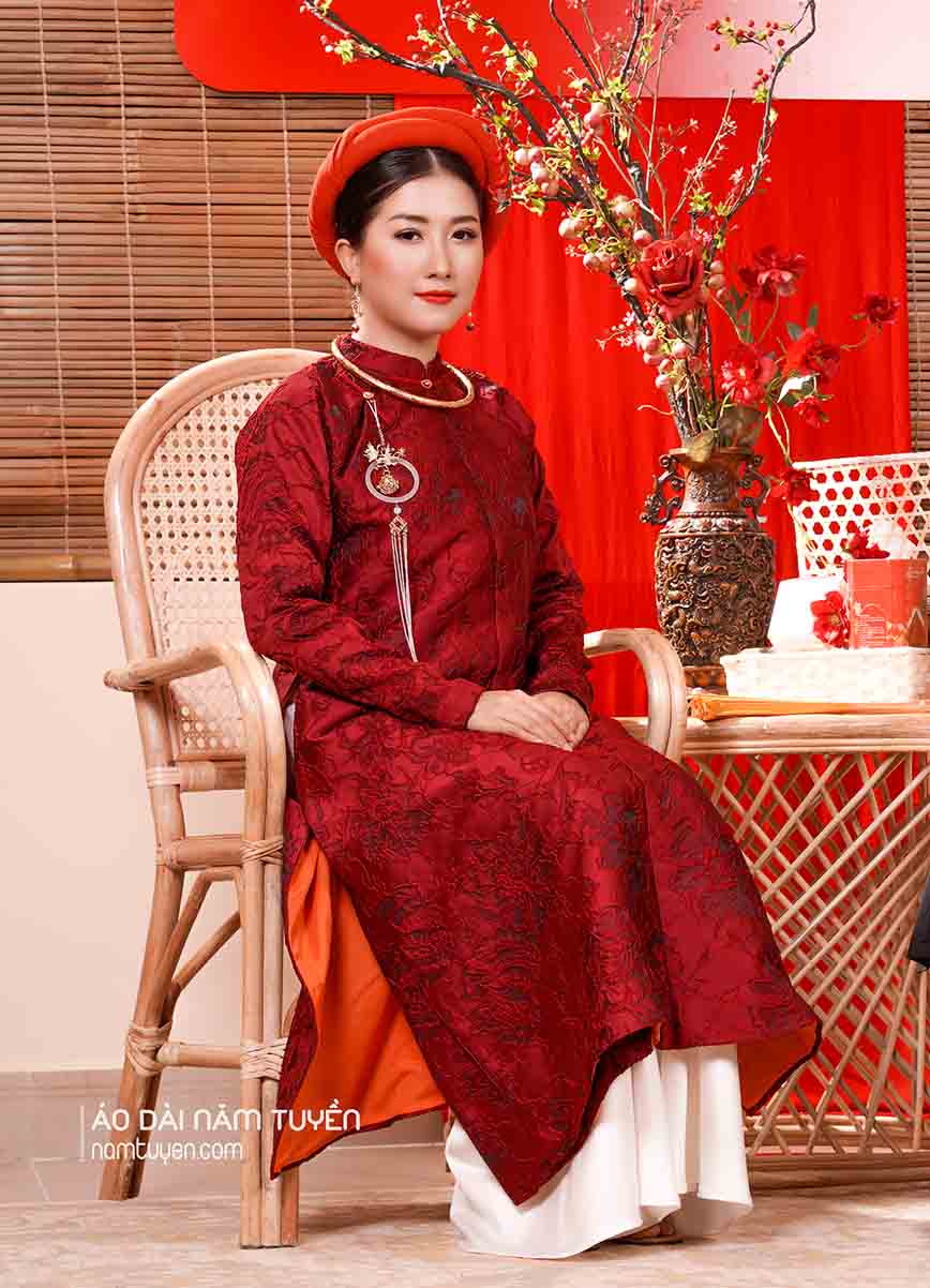 Áo dài nữ ngũ thân gấm đỏ, phong cách truyền thống trang trọng