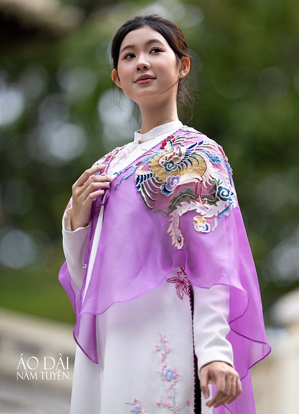 Áo dài ngũ thân satin trắng kết hợp lụa Nha Xá – Họa tiết hoa & áo choàng Phượng bay