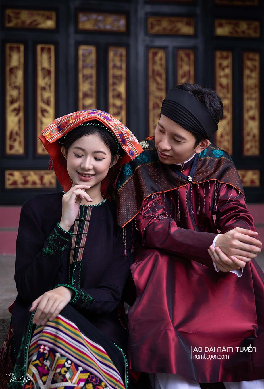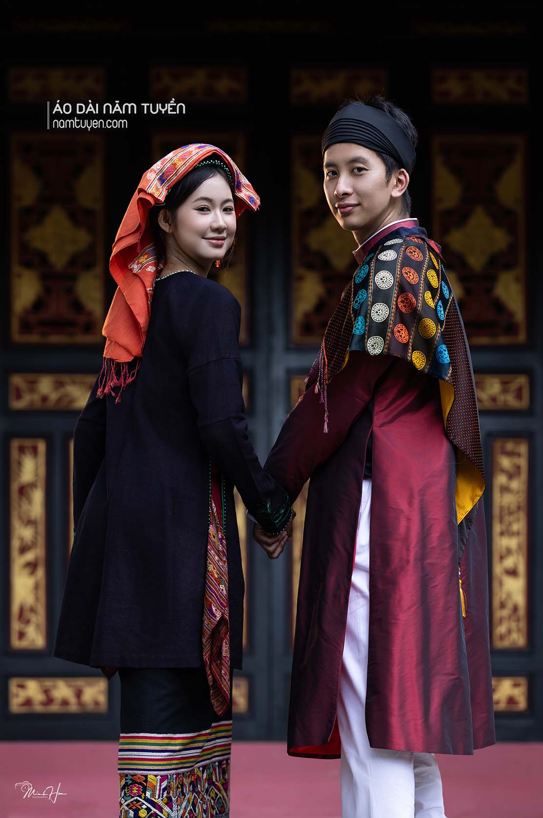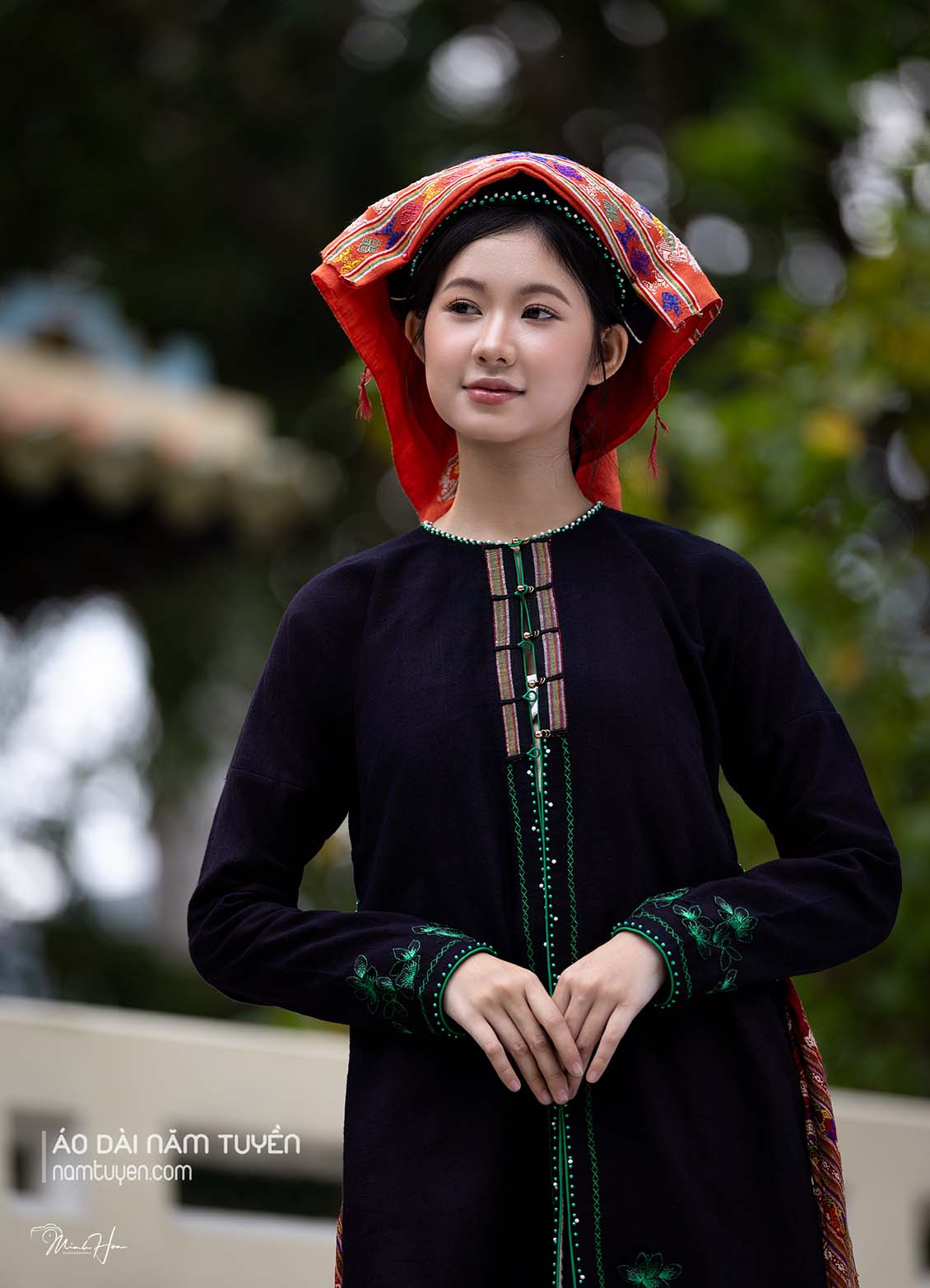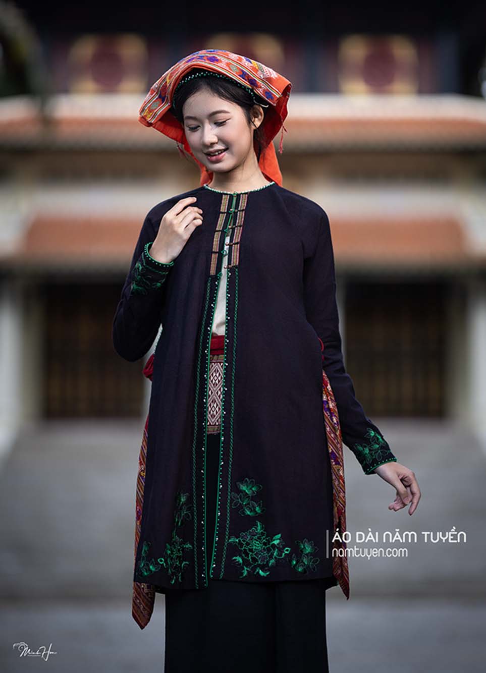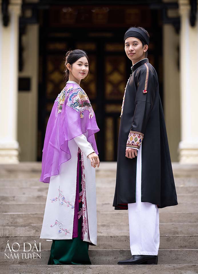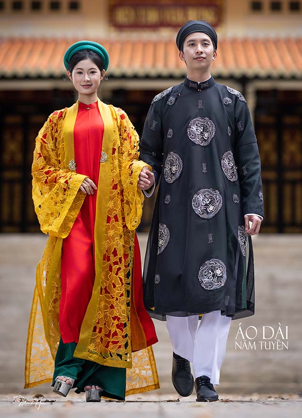 Tựa như đóa lan vươn mình giữa sắc đỏ thắm, tỏa hương thanh khiết và vẻ đẹp đoan trang của người phụ nữ Việt, hòa cùng áo choàng ren họa tiết phong cách Tây phương màu vàng kim tựa ánh triều dâng, gợi nét uy nghi mà vẫn dịu dàng, thánh thiện. Mỗi đường kim, nếp lụa là tiếng vọng của truyền thống, nơi cái đẹp cổ truyền gặp gỡ tinh thần sáng tạo hôm nay – nhẹ nhàng mà quyền quý, kín đáo mà rực rỡ tựa ánh bình minh Thăng Long.