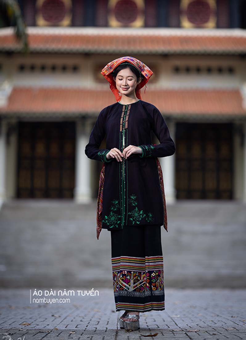 Việc sử dụng thổ cẩm trong trang phục áo dài truyền thống sẽ là điểm nhấn trong sự giao hòa giữa các sắc màu dân tộc. Khéo léo trong tinh tế xử lý phối hợp màu sắc và hoa văn trong trang phục không chỉ là thời trang mà còn là sự hiểu biết đồng điệu giữa các nền văn hóa bản địa. Điểm nhấn cốt Piêu trên cánh tay áo là biểu tượng xua đuổi tà khí mang lại sự yên vui của đồng bào Thái Đỏ.