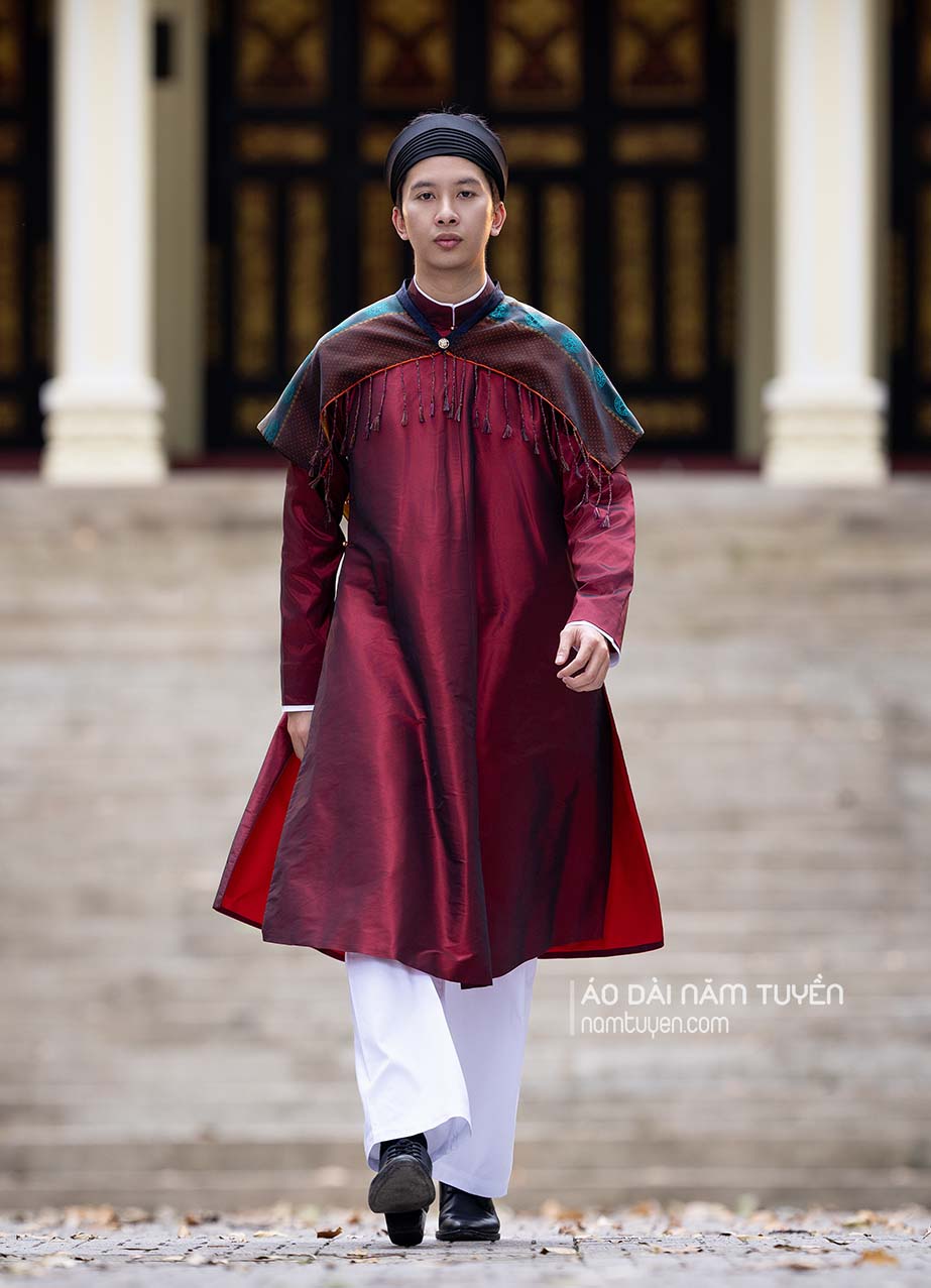 Phong cách người Hà Nội trong sắc màu di sản. Màu đỏ đô đằm thắm làm chủ đạo – màu của sự ấm áp của tình yêu và nghị lực được thể hiện trong tà áo đơn sắc, khoác cùng lên tấm áo choàng lụa tơ tằm Vạn Phúc dệt hoa văn biểu tượng trống đồng - Thủ đô Hà Nội (một sản phẩm lụa độc đáo đã đoạt giải nhì trong thiết kế sáng tạo 2023).