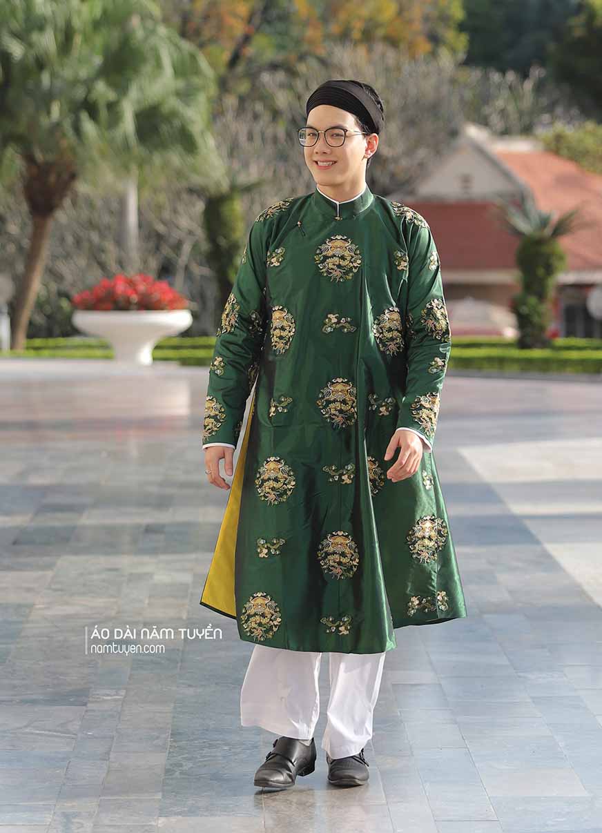 Trên nền lụa tơ tằm Hà Đông, Nha Xá và Bảo Lộc, các họa tiết Rồng, Phượng, vân mây, hoa thọ, thổ cẩm được thêu thùa bằng kỹ thuật truyền thống ứng dụng trên máy thêu vi tính hiện đại, với lối bố cục hiện đại cùng sắc màu truyền thống: đỏ, vàng, đen, trắng, xanh lá giao hòa như ngũ hành tương sinh, tạo nên vẻ đẹp vừa cổ điển, vừa tươi mới.