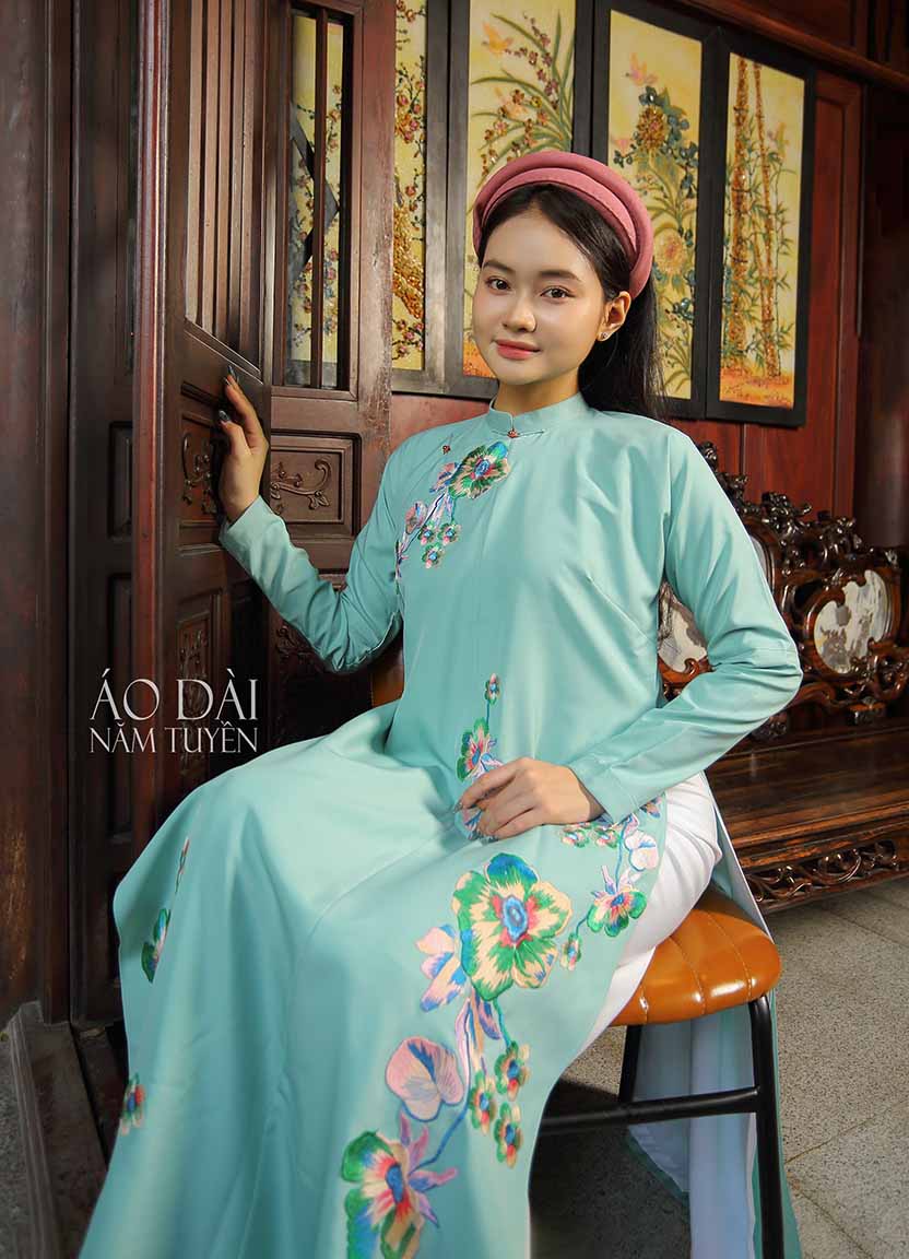 Áo dài nữ ngũ thân truyền thống xanh mint trang trí hoa 3d