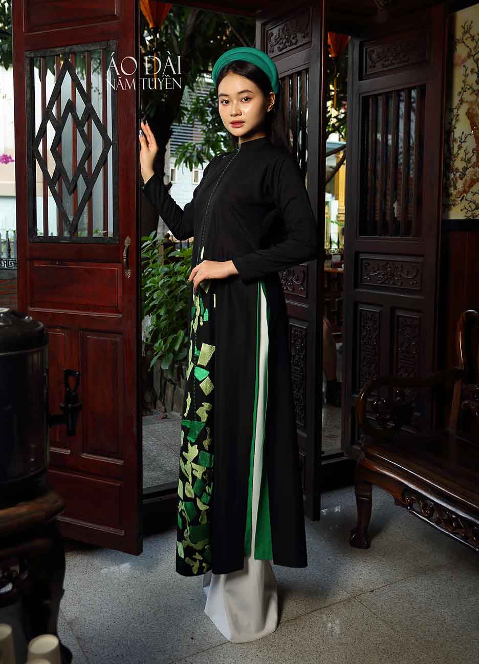 Áo dài ngũ thân nữ màu đen truyền thống thêu họa tiết trừu tượng