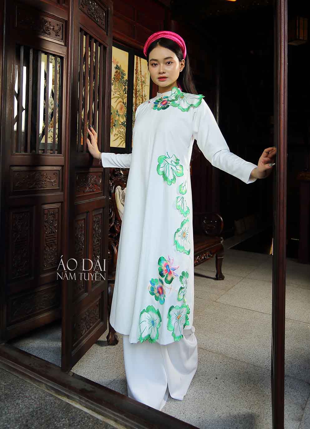 Áo dài ngũ thân nữ trắng thiết kế ren và hoa – Vẻ đẹp trong trẻo, hiện đại