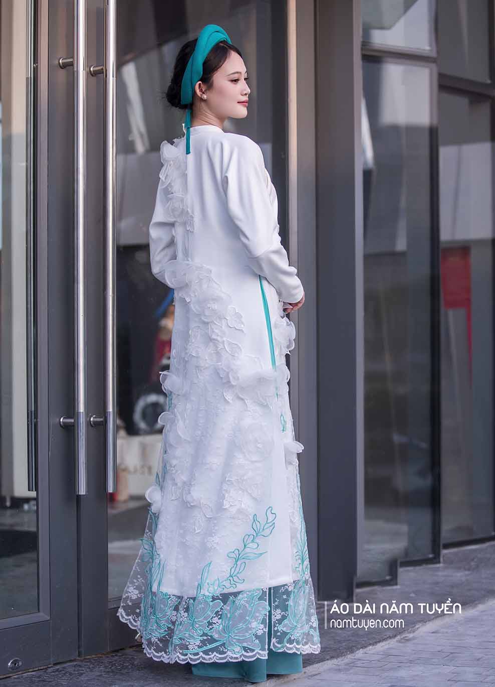 Áo dài nữ trắng phủ ren – Hoa ren 3D dọc thân áo sống động
