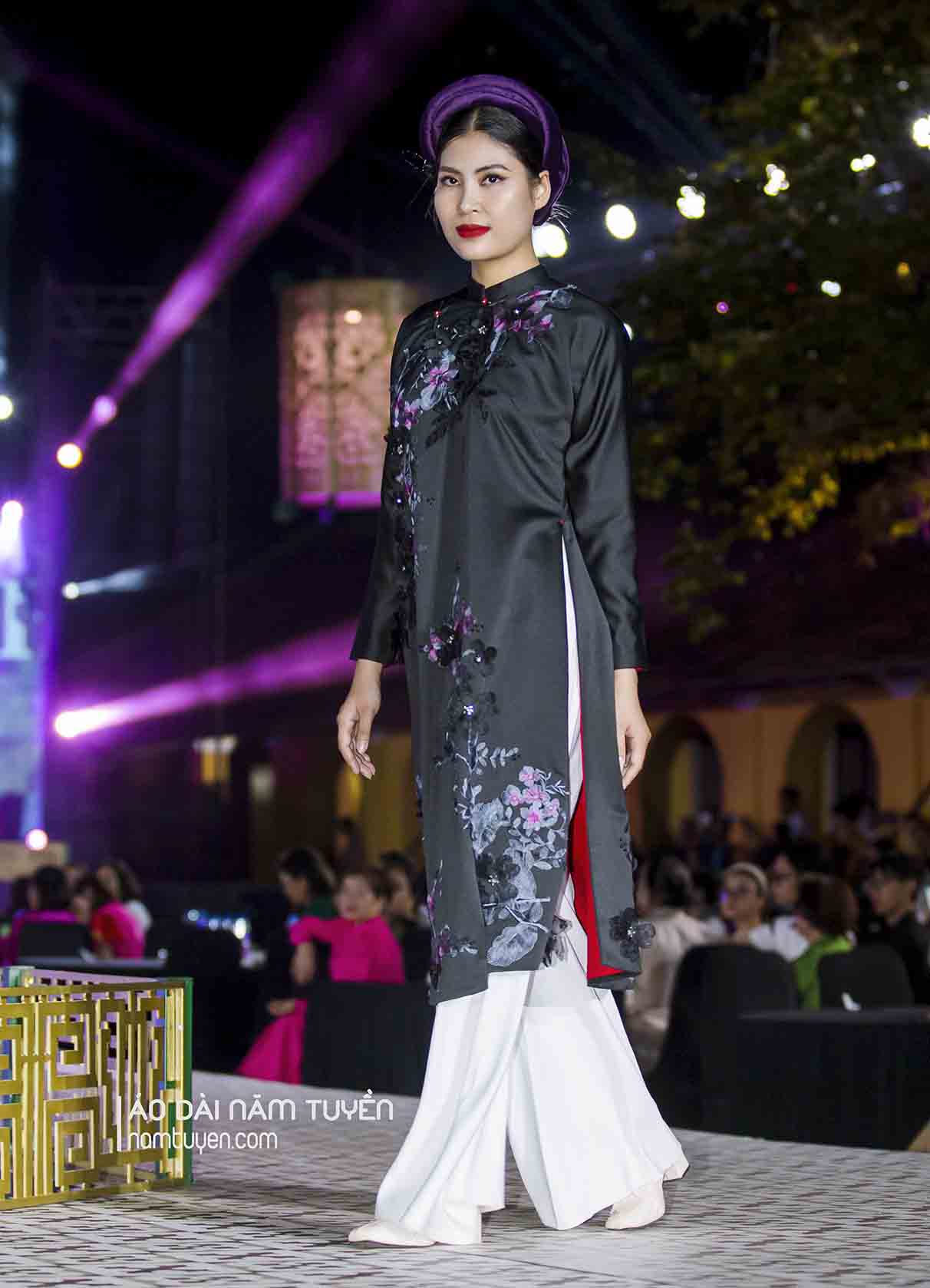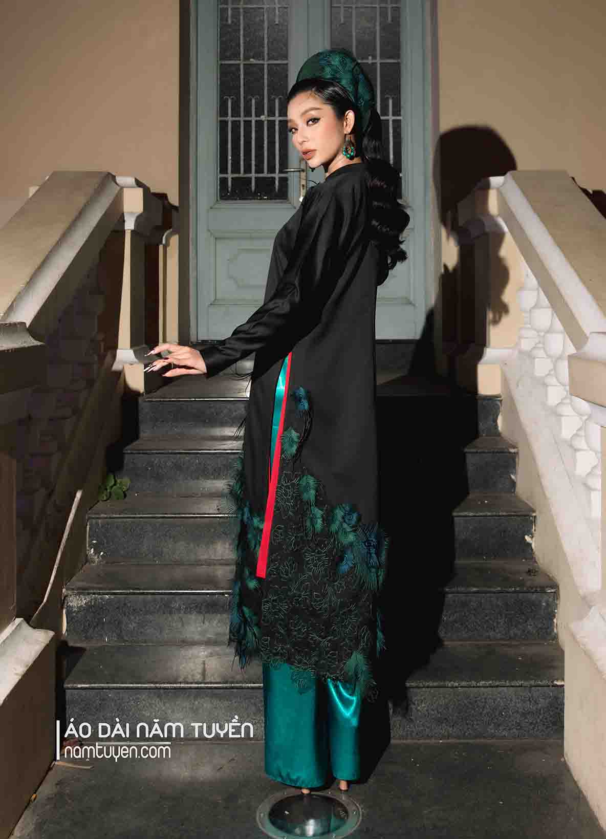 Áo dài truyền thống nữ ngũ thân satin đen thêu thủy ba ấn tượng