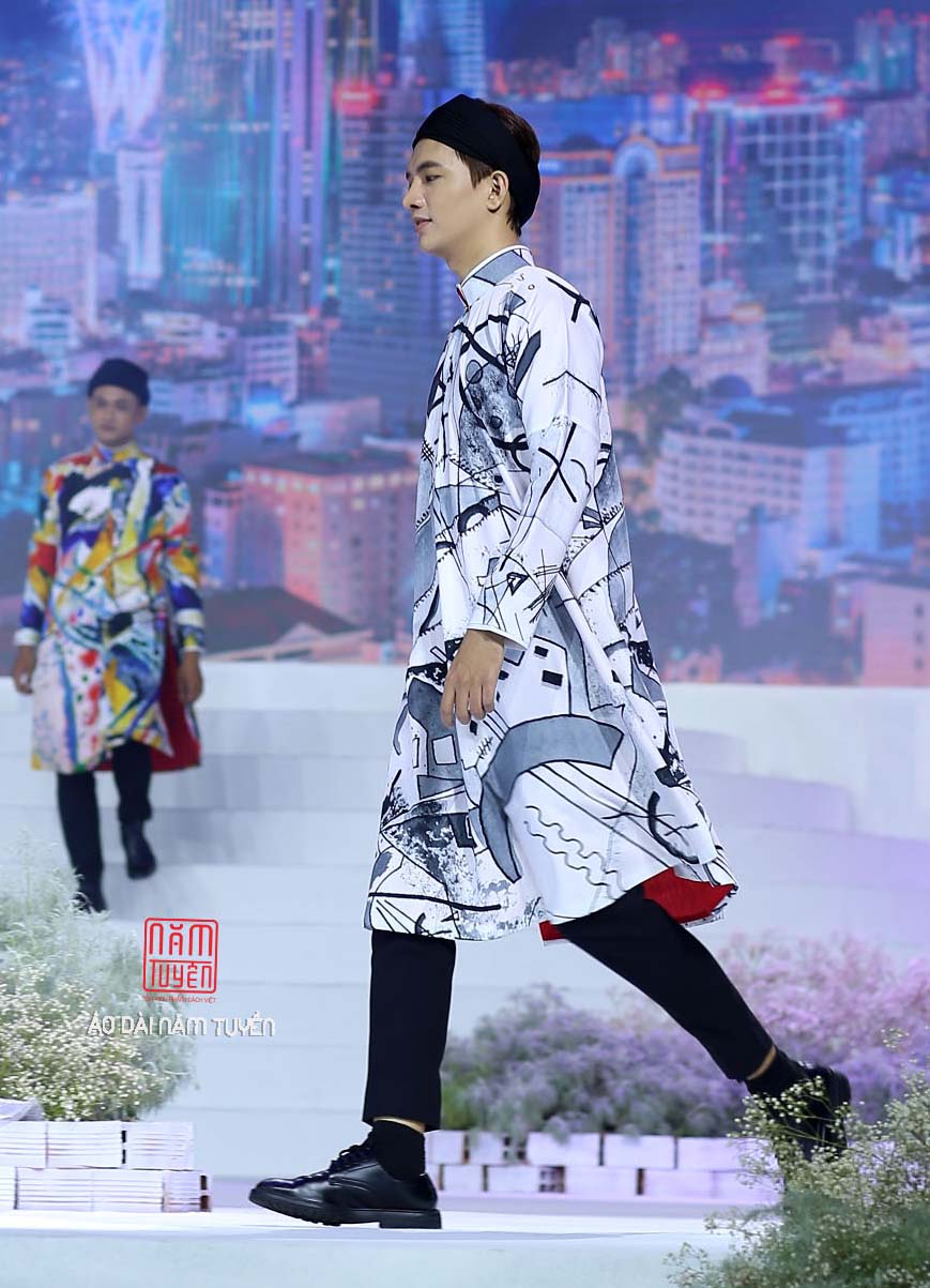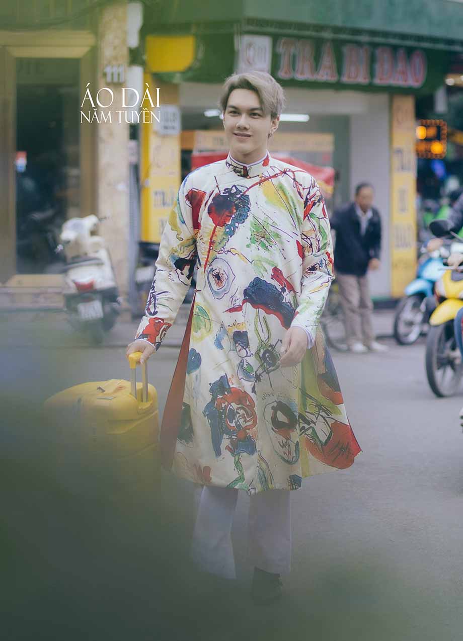 Áo dài nam in họa tiết hiện đại năng động trên phố